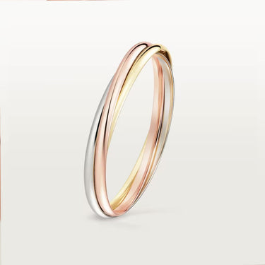 Timeless and symbolic, this tricolor interlocking bracelet showcases a sleek blend of yellow, rose, and white gold tones—representing unity, love, and balance.