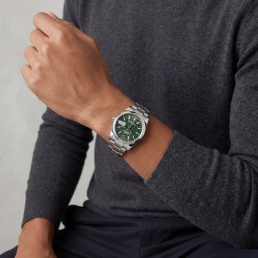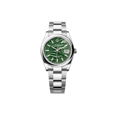 The Datejust Olive Green Palm-Motif Dial Men's Watch features a palm-motif dial that adds visual texture while keeping the layout clean and easy to read. Luminescent hands and stick hour markers support clear visibility, and the date display at 3 o’clock provides practical daily reference. A fixed domed bezel maintains a smooth, streamlined case profile, paired with an Oyster-style bracelet and Oysterclasp for a secure, everyday fit.
