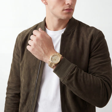 A day window at 12 o’clock and a date window at 3 o’clock bring practical function to the jewelry-forward design. Finished with a matching metal link bracelet, this piece wears like a statement accessory-ideal for dressier looks or as a standout highlight with simple outfits.