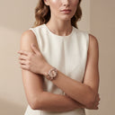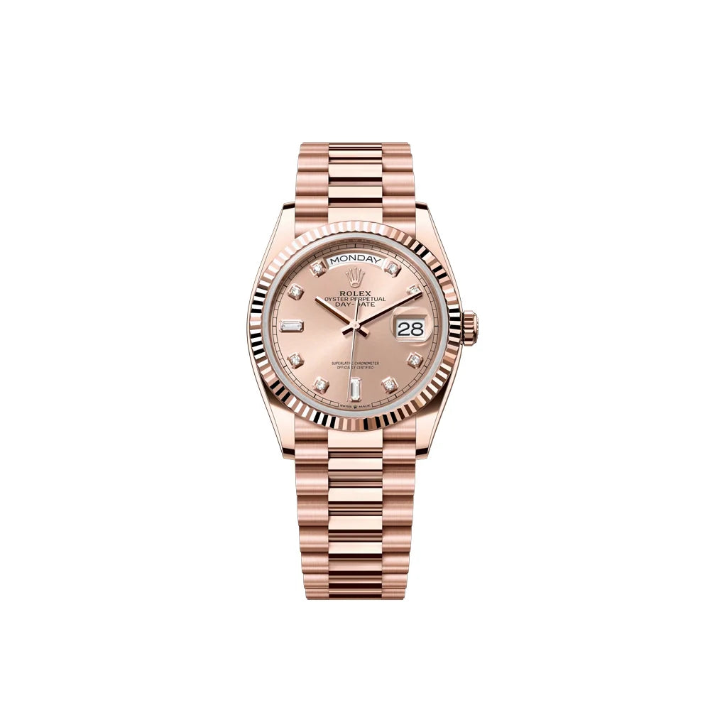 Day-Date Pink Dial Women’s Watch features a refined 31mm round case paired with a President-style bracelet and a fixed fluted bezel. The pink dial is detailed with CZ hour markers and matching hands, with the date displayed at the 3 o’clock position for clear daily readability.