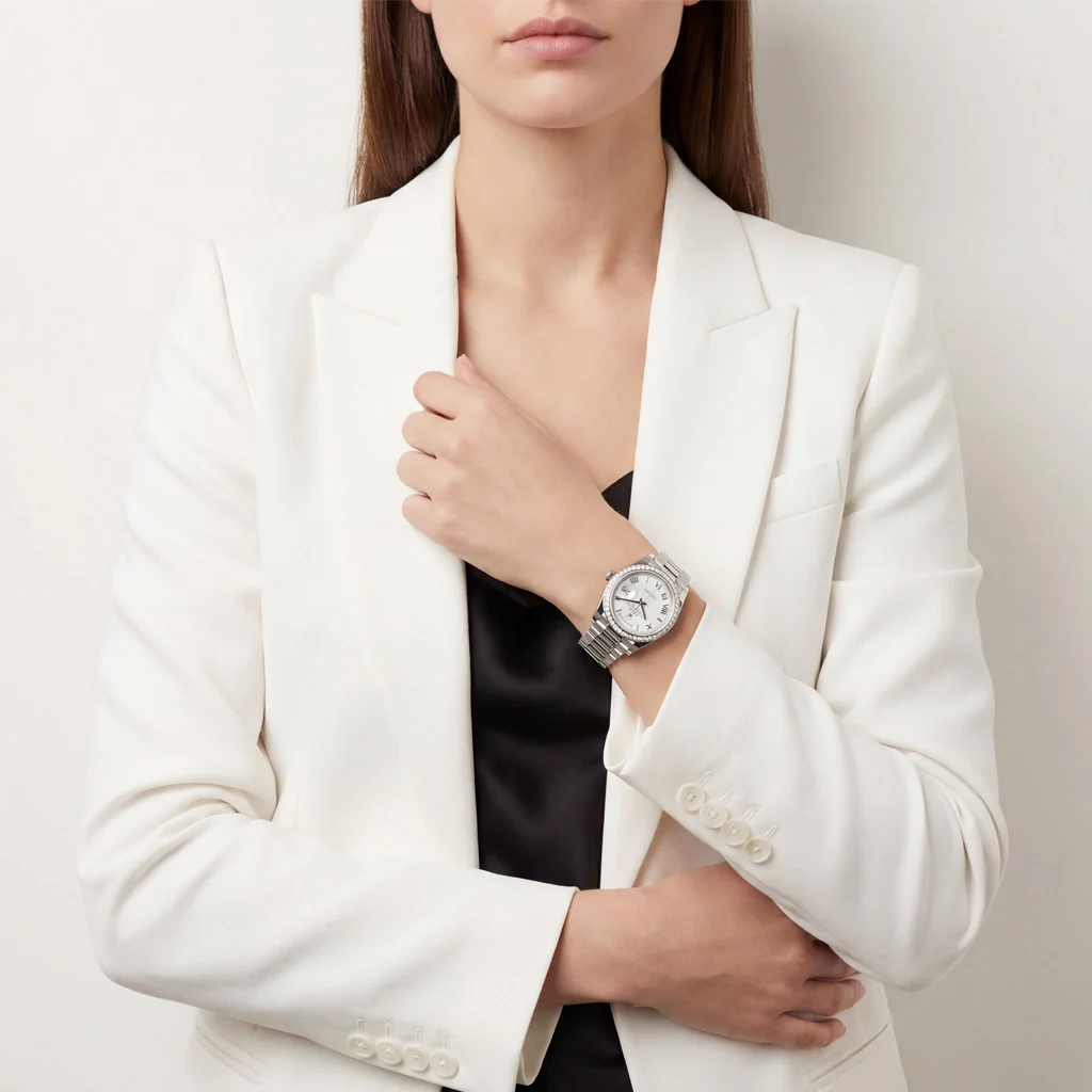 The Day-Date White Roman Dial Bezel Women’s Watch is a refined expression of elegance and precision, designed for women who appreciate timeless luxury.