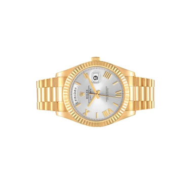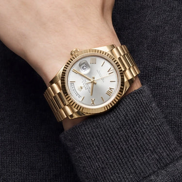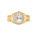 The President Day Date Silver Dial Mens Watch delivers a classic dress-watch silhouette with a Roman numeral dial layout and the signature day-and-date display for everyday practicality. The day window at 12 o’clock and date window at 3 o’clock keep the dial balanced and easy to reference, while the fluted bezel adds a refined, structured profile that stands out without feeling overstated.