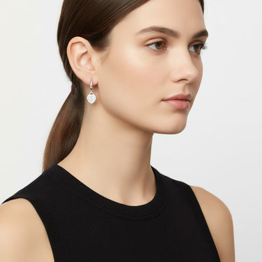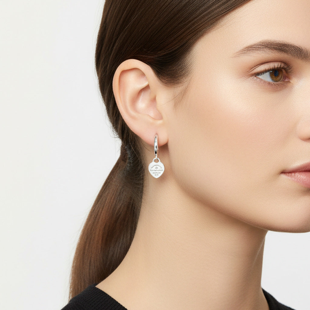Sleek hoops are paired with engraved heart-shaped drop tags, offering a nostalgic nod through vintage-inspired lettering. Lightweight and thoughtfully designed, these earrings transition effortlessly from casual to elevated occasions—making them a versatile, go-to favorite.