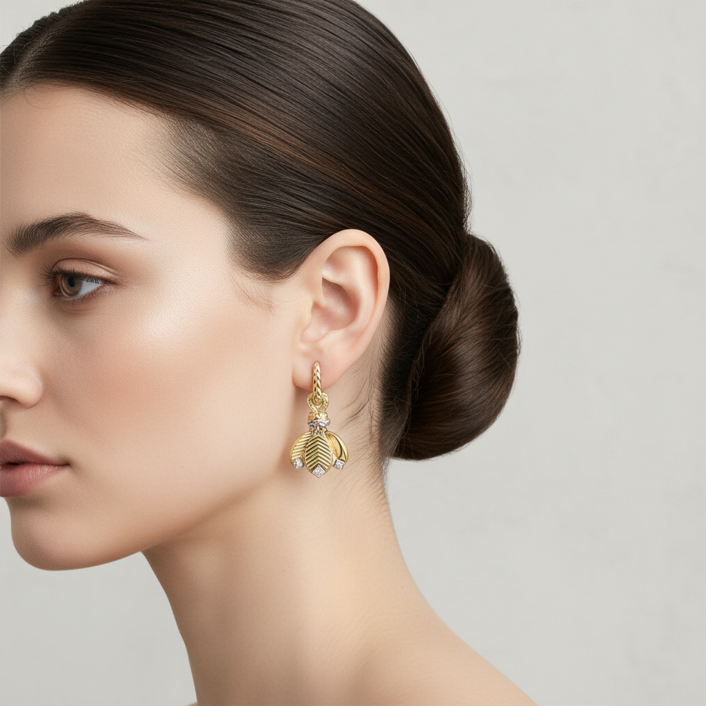 Expertly crafted from 925 sterling silver and finished in 18K yellow gold vermeil, each earring features three sculpted coffee bean-inspired elements — a subtle symbol of abundance and artisanal heritage. Clear cubic zirconia (CZ) accents add a soft, refined sparkle that enhances the design without overpowering its sculptural form.