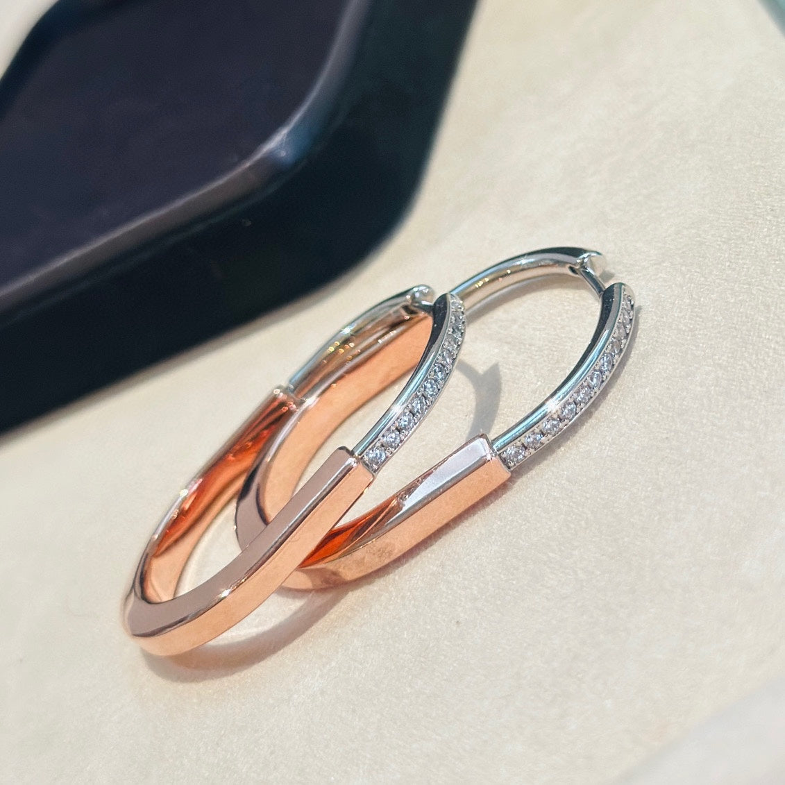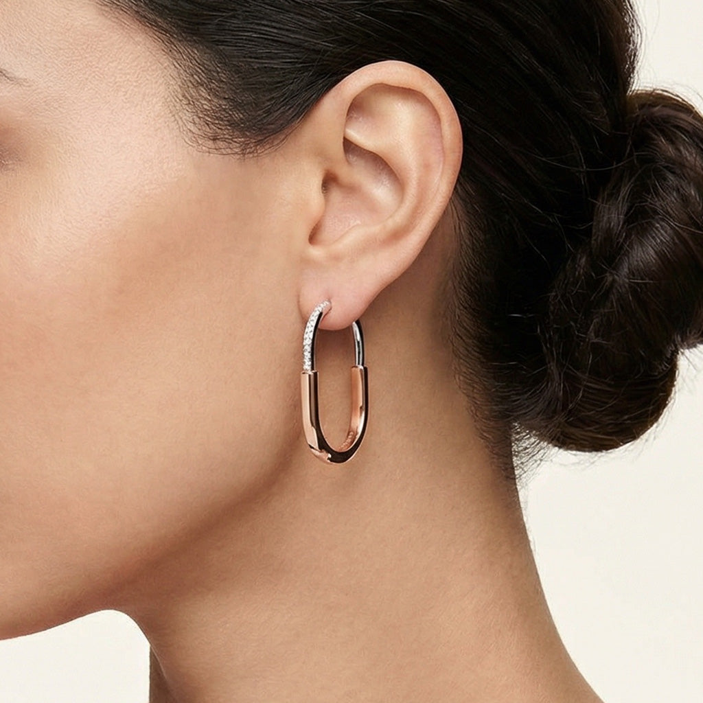 The T Lock Earrings are a striking blend of minimalist design and refined sparkle. Featuring a dual‑tone silhouette in warm rose and sleek white gold vermeil, they are set with brilliant cubic zirconia (CZ) stones that add a radiant, modern touch to your look.