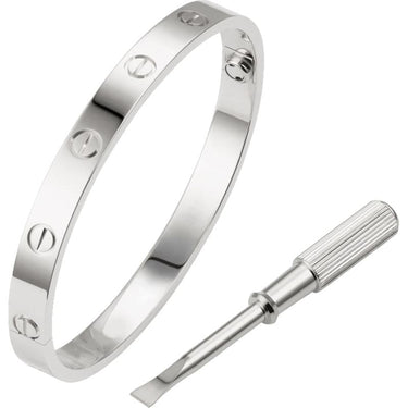 With a 6.5 mm width and a signature screw‑motif design, this bracelet blends clean lines with meaningful symbolism. The mirror‑polished finish enhances its sculptural form, while a secure hinge clasp provides a streamlined, tailored look.