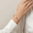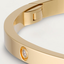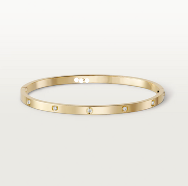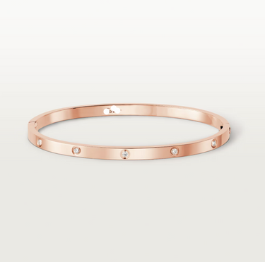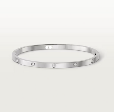 With a slim 3.65 mm band, the bracelet is embellished with ten bezel-set cubic zirconia (CZ) stones, delivering a soft sparkle that enhances — rather than overpowers — its minimalist design. Signature screw-motif accents and a secure hinged clasp contribute to its clean, modern silhouette.