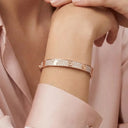 Accented with pavé-set cubic zirconia (CZ) stones across its 6.7 mm width, the bracelet delivers a luxurious shimmer that enhances its contemporary silhouette. With a 3 mm thickness and an adjustable fit for wrists sized 16–19 cm, it ensures all-day comfort and a secure fit.