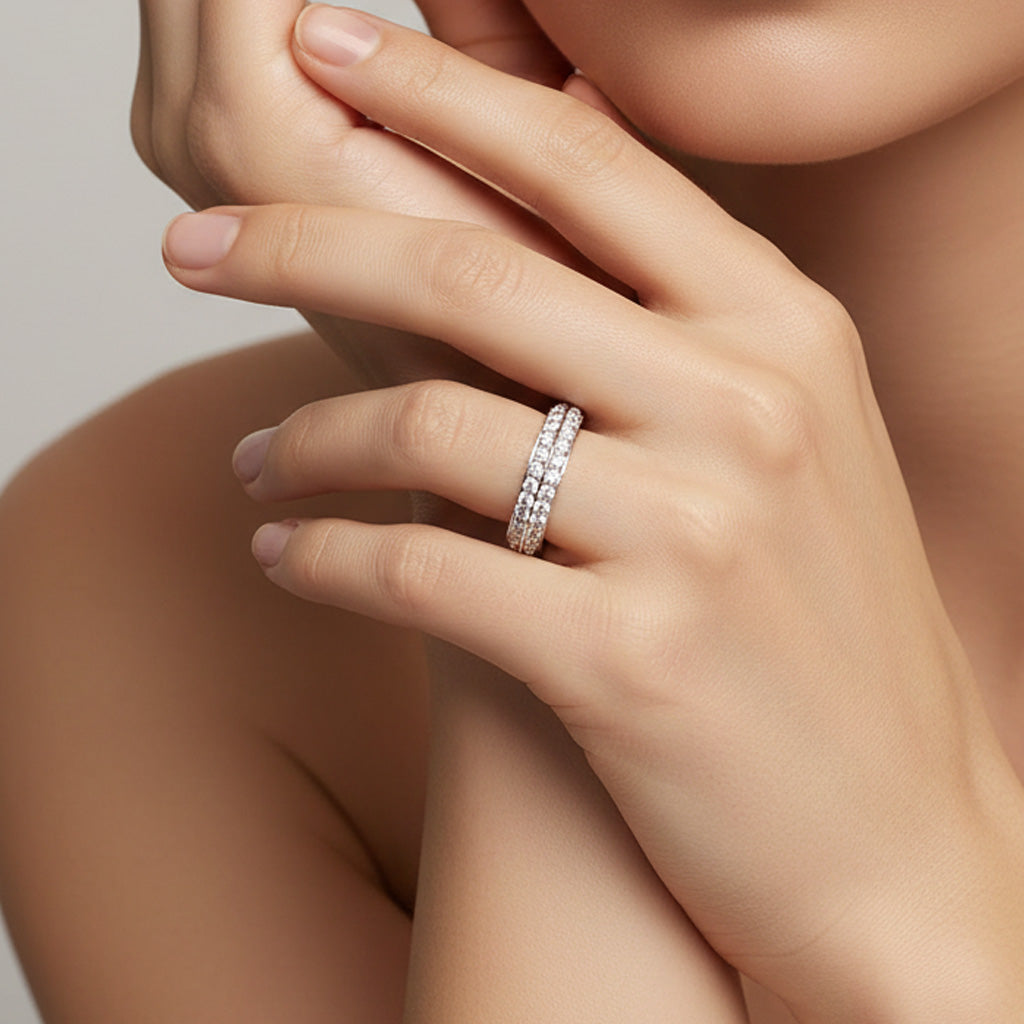 The band features a continuous pavé of round‑cut cubic zirconia, creating a sleek double‑row sparkle that reflects the meaning of forever through each shimmering detail.