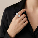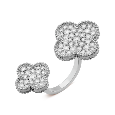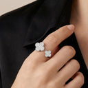 Elegant and eye-catching, the Floral Clover Between-the-Finger Ring features two shimmering motifs that symbolize luck, beauty, and harmony. Each clover is meticulously set with cubic zirconia (CZ) stones, adding radiant sparkle and enhancing the design’s refined charm.