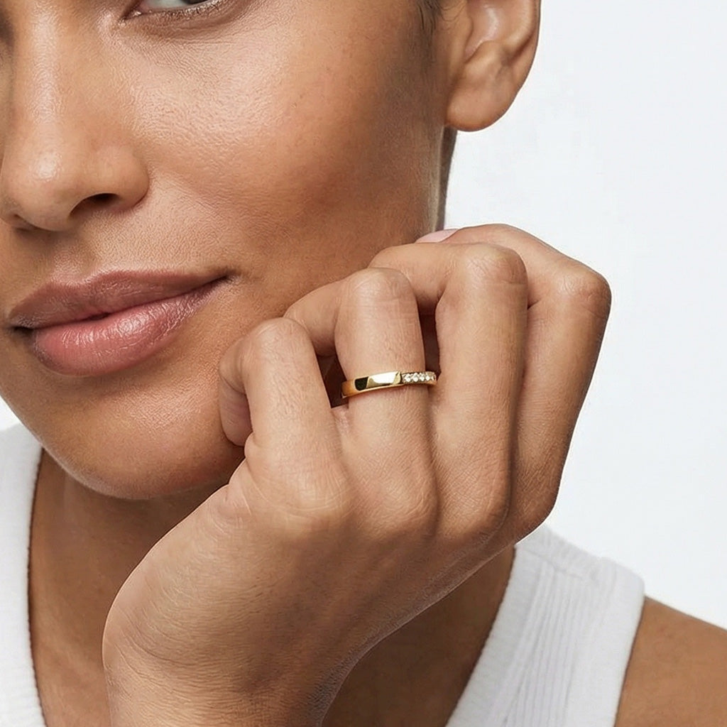 Elevate your jewelry collection with the Lock Ring, crafted from 18K gold vermeil over a durable 925 sterling silver base. The design features a sleek 4.5 mm band accented with sparkling cubic zirconia (CZ) stones, offering a refined touch of shimmer.