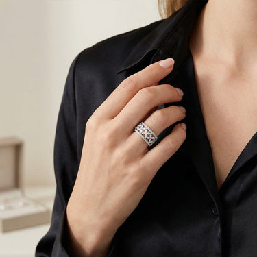 The Marquise Victoria Wide Band Ring brings timeless sophistication to modern styling, featuring a romantic motif of marquise-shaped accents and delicate pavé sparkle.
