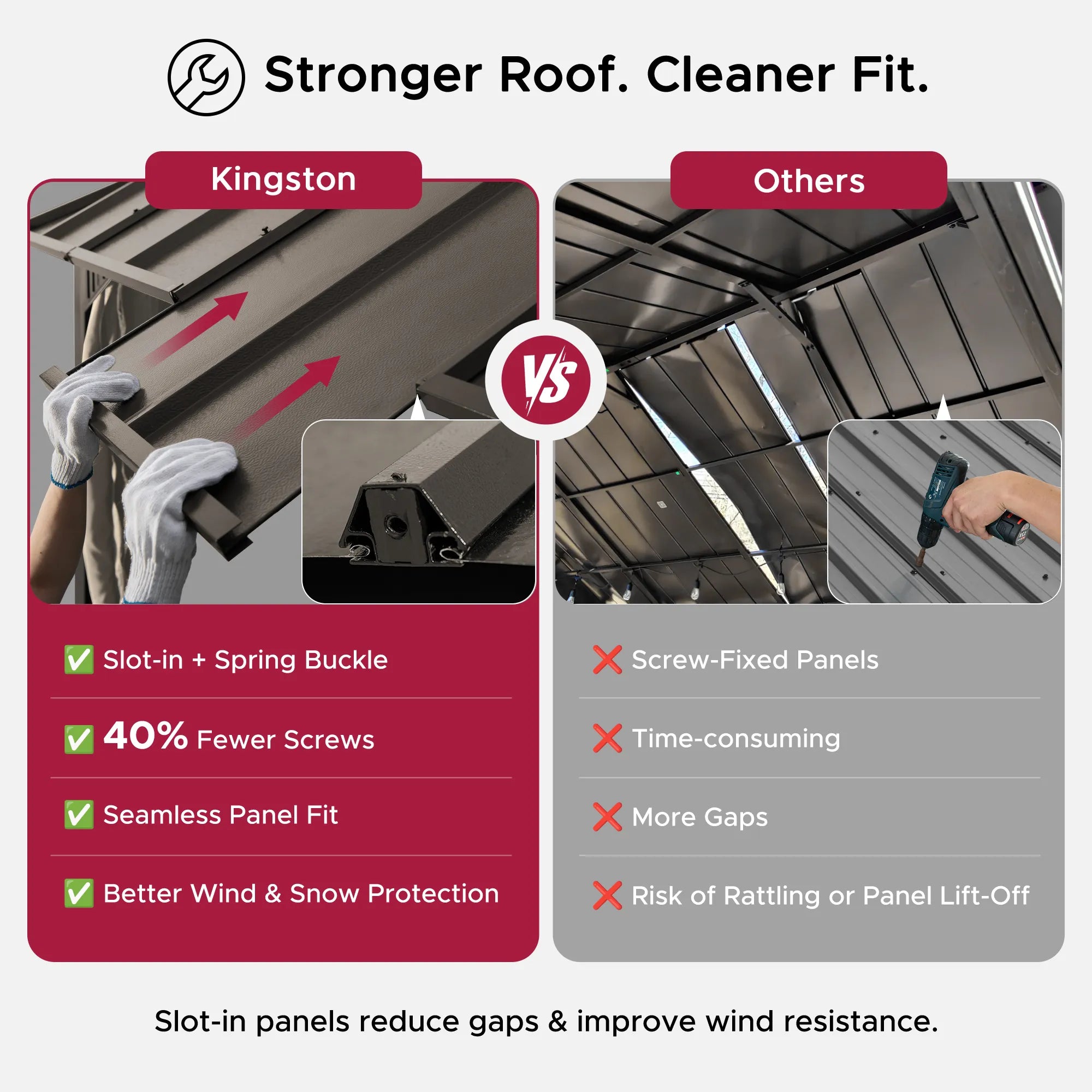 Crafted for strength and convenience, the galvanized steel double-tier roof provides excellent airflow and weather resistance, while zippered privacy curtains and dense mosquito netting offer complete enclosure. Assembly is simplified with the upgraded insert-style panel system, requiring fewer screws for a faster, more stable setup.