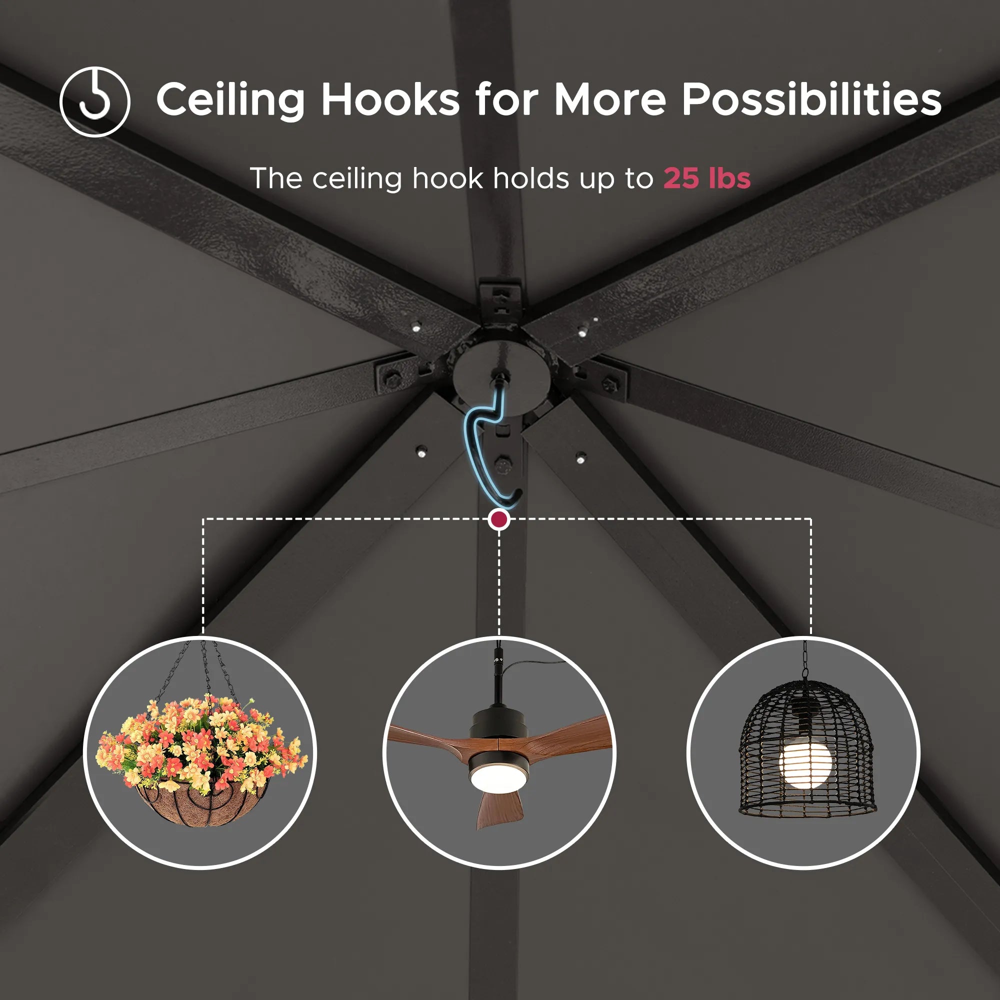 With pre-drilled anchor plates for both soft and hard surface installation, stainless steel roof screws for corrosion resistance, and a built-in ceiling hook for lighting or fans, this gazebo ensures long-lasting enjoyment through every season.