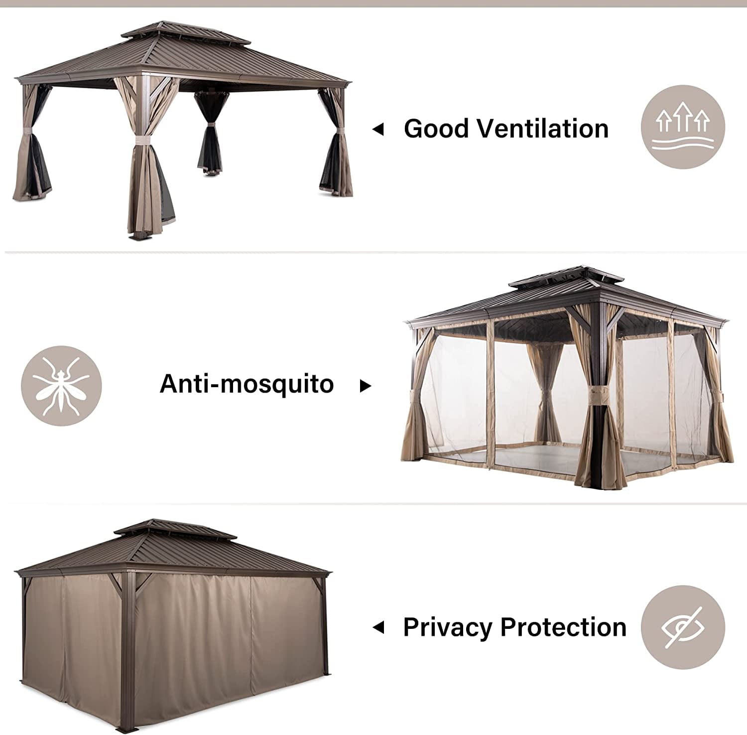 - The whole frame of this hardtop gazebo is made of aluminum, and the double-roof hard top adopts galvanized steel, making it durable for long-time use with its water, fade, and rust-proof features.