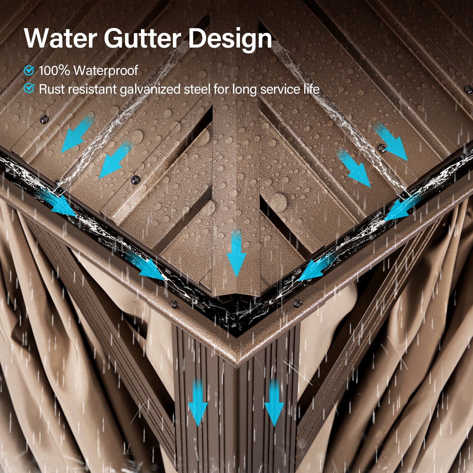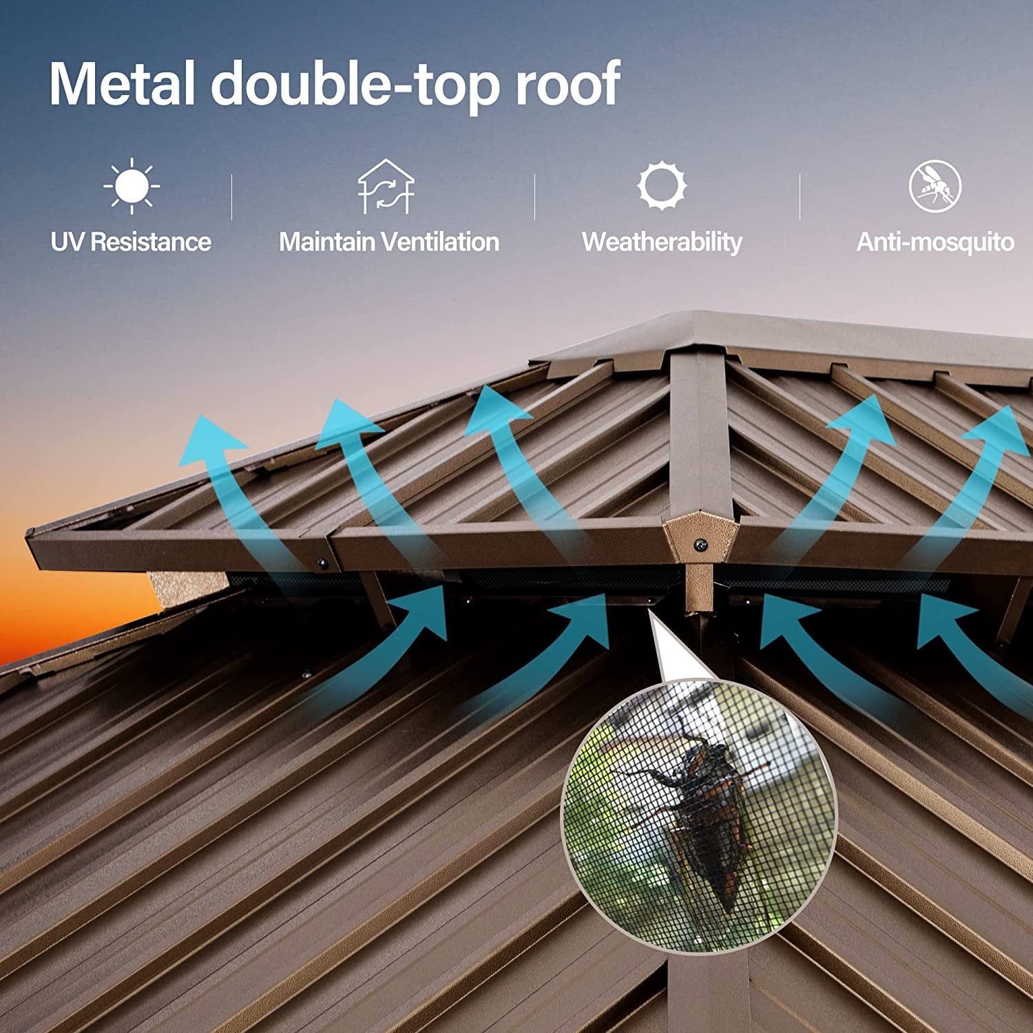 - Designed with a drainage ditch system to guide rainwater and protect this outdoor gazebo from corrosion, the metal net between the tops can ensure internal air circulation and block leaves and bugs.