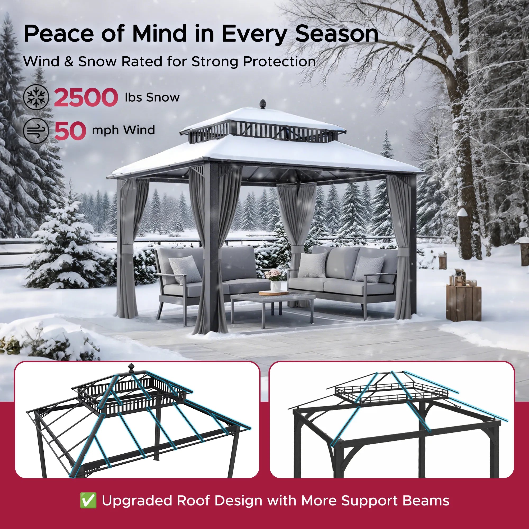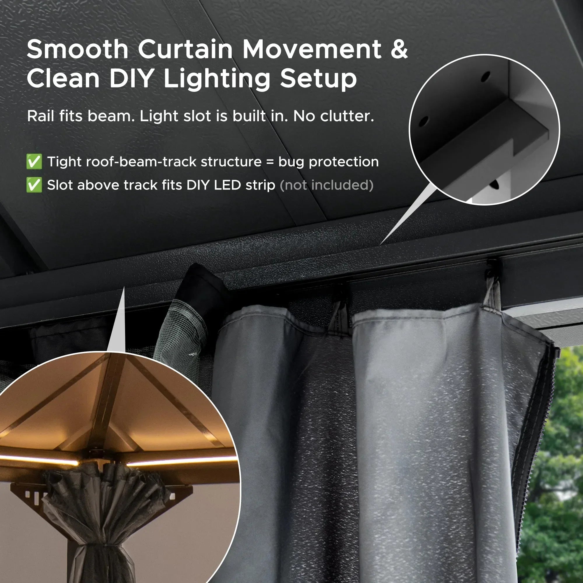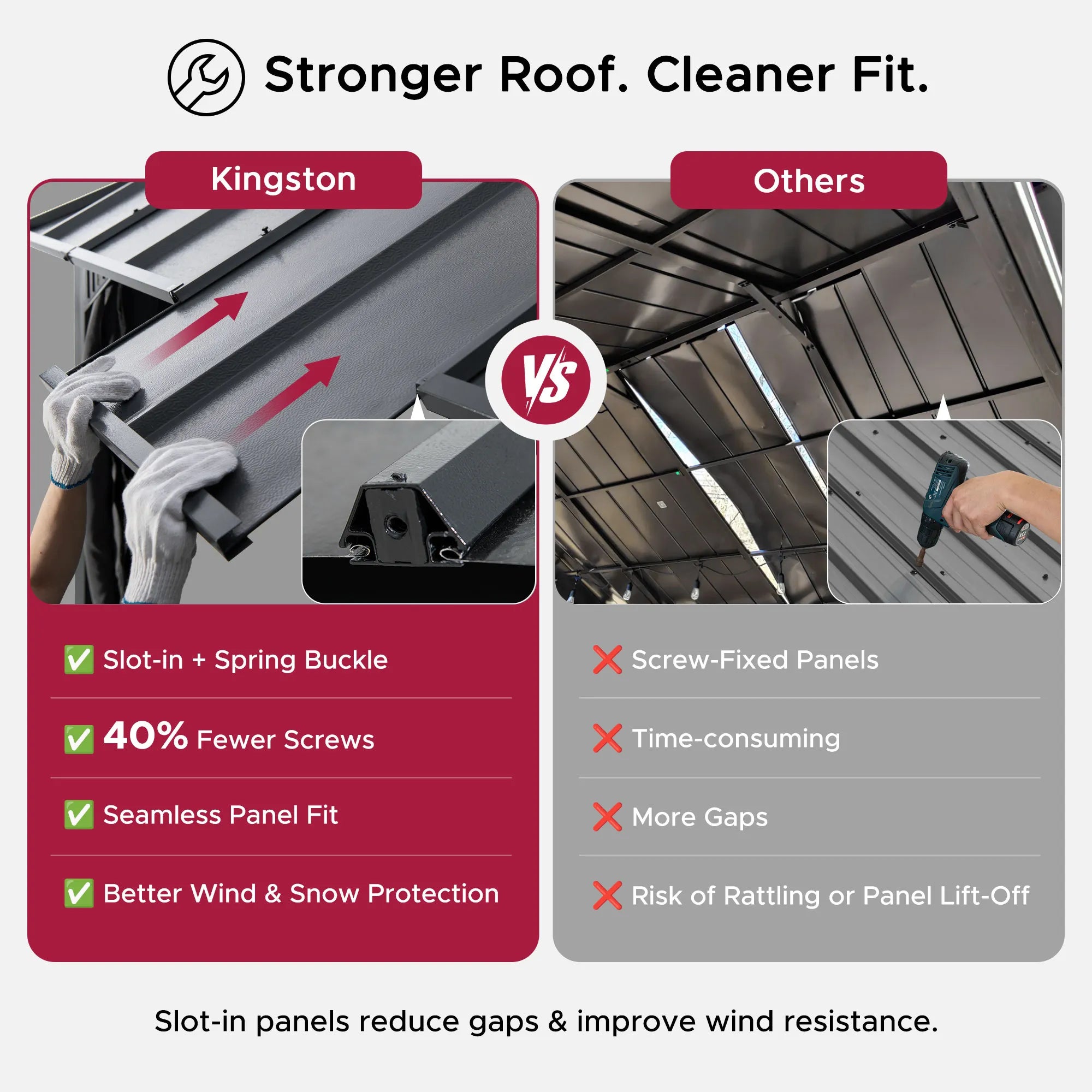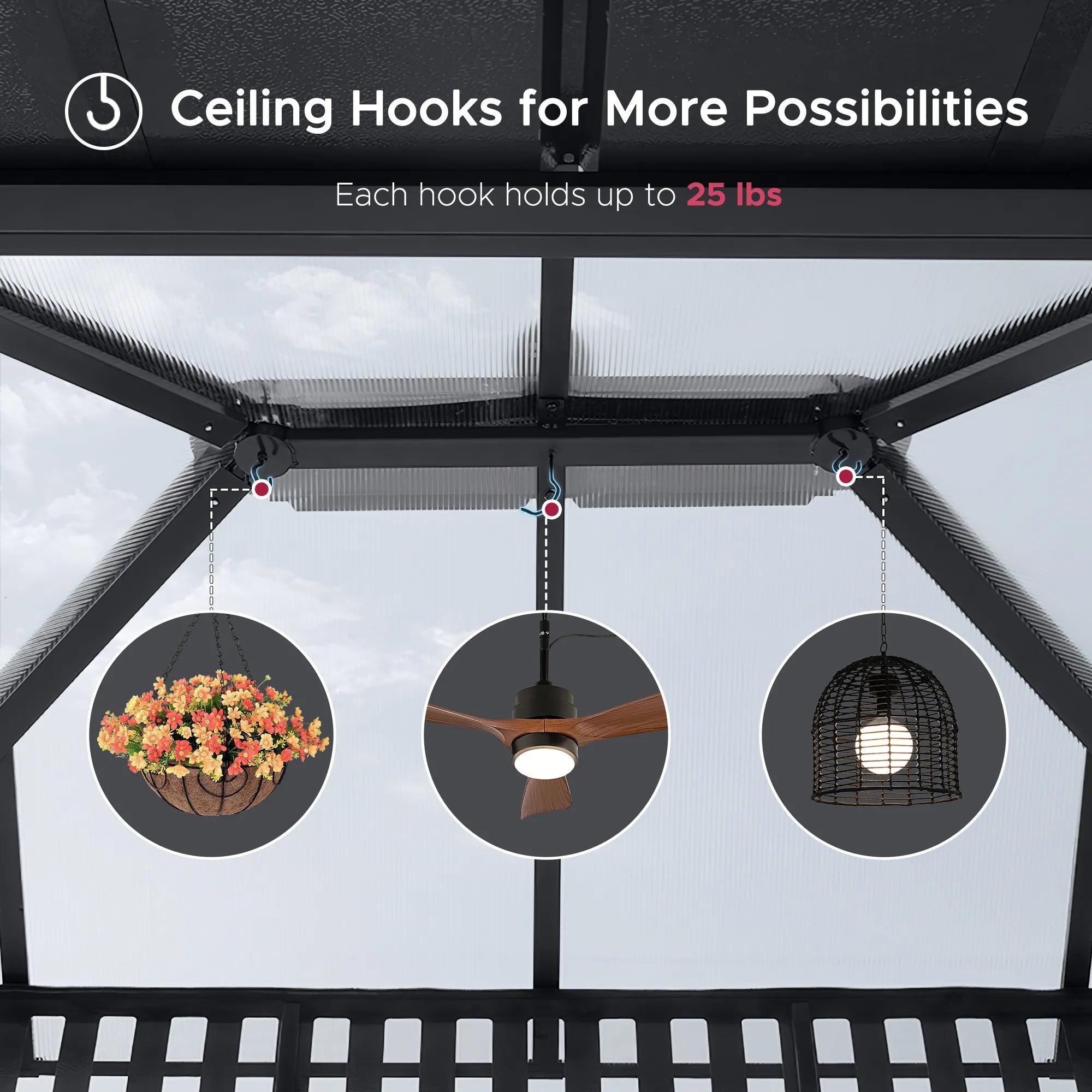 Enjoy easy assembly with a design focused on speed and secure installation. With 40% fewer screws and intuitive snap-together panels, setup is significantly faster. Stainless steel roof screws provide superior weather resistance, while three built-in hooks offer convenience for hanging lights, fans, or decor. Ground plates with pre-drilled holes ensure solid anchoring on both hard surfaces and soft ground.