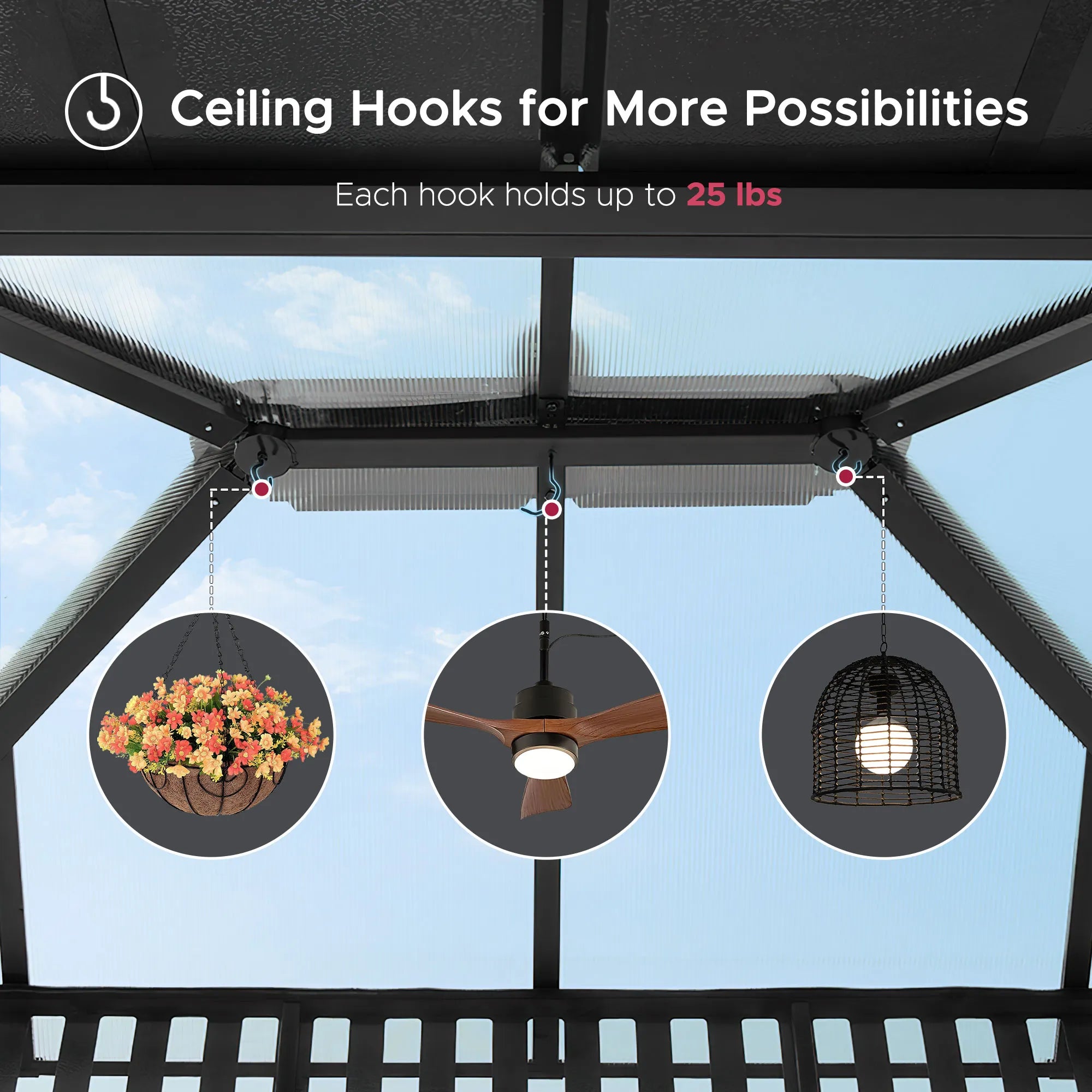 Quick to assemble, the upgraded roof system uses 30–40% fewer screws than traditional designs. Stainless steel screws on the roof enhance durability, and ceiling hooks let you personalize your space with lighting or fans. Ground plates include pre-drilled holes for easy anchoring on soft or hard surfaces.