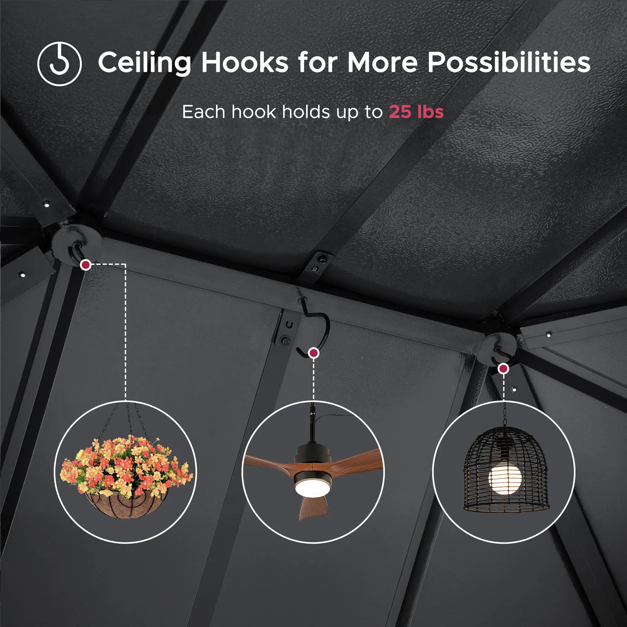 Assembly is streamlined with the insert-style roof panel system that requires fewer screws and enhances wind resistance. With ceiling hooks for custom lighting and pre-drilled anchor plates for secure setup, this gazebo makes outdoor comfort effortless and lasting.