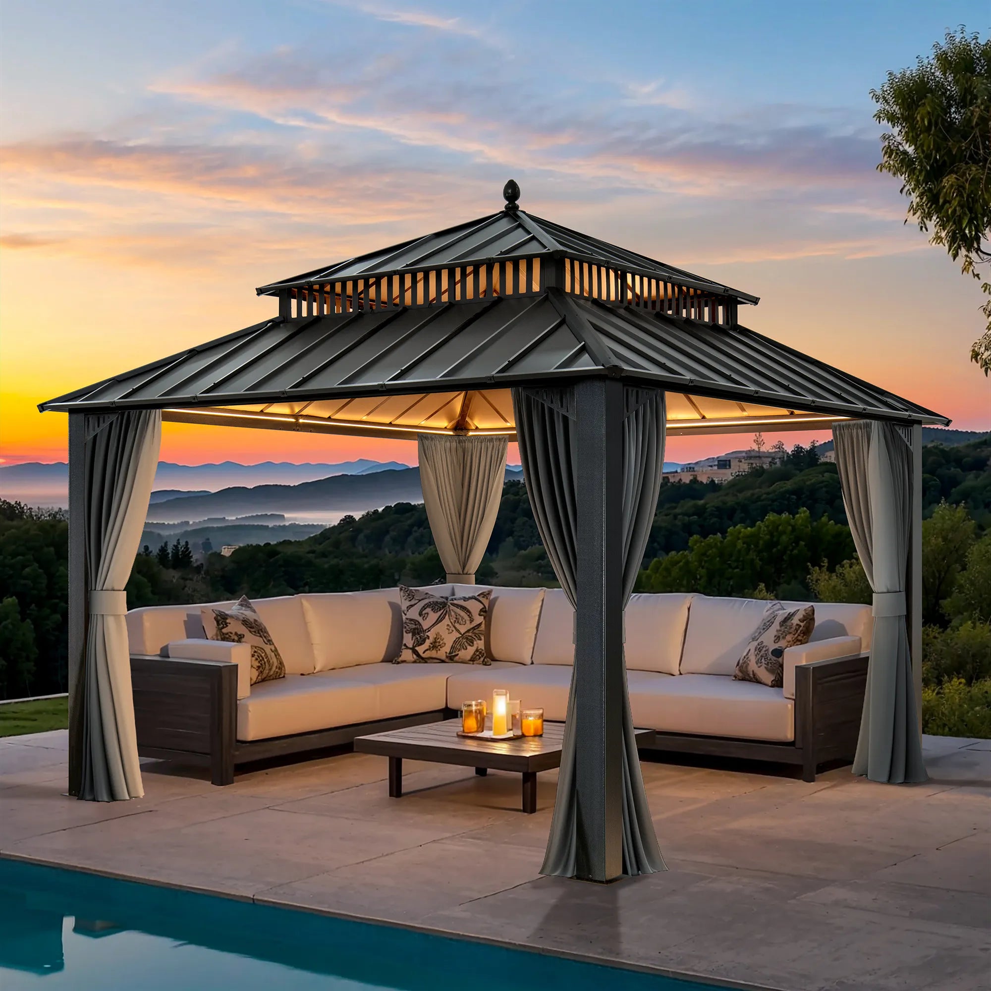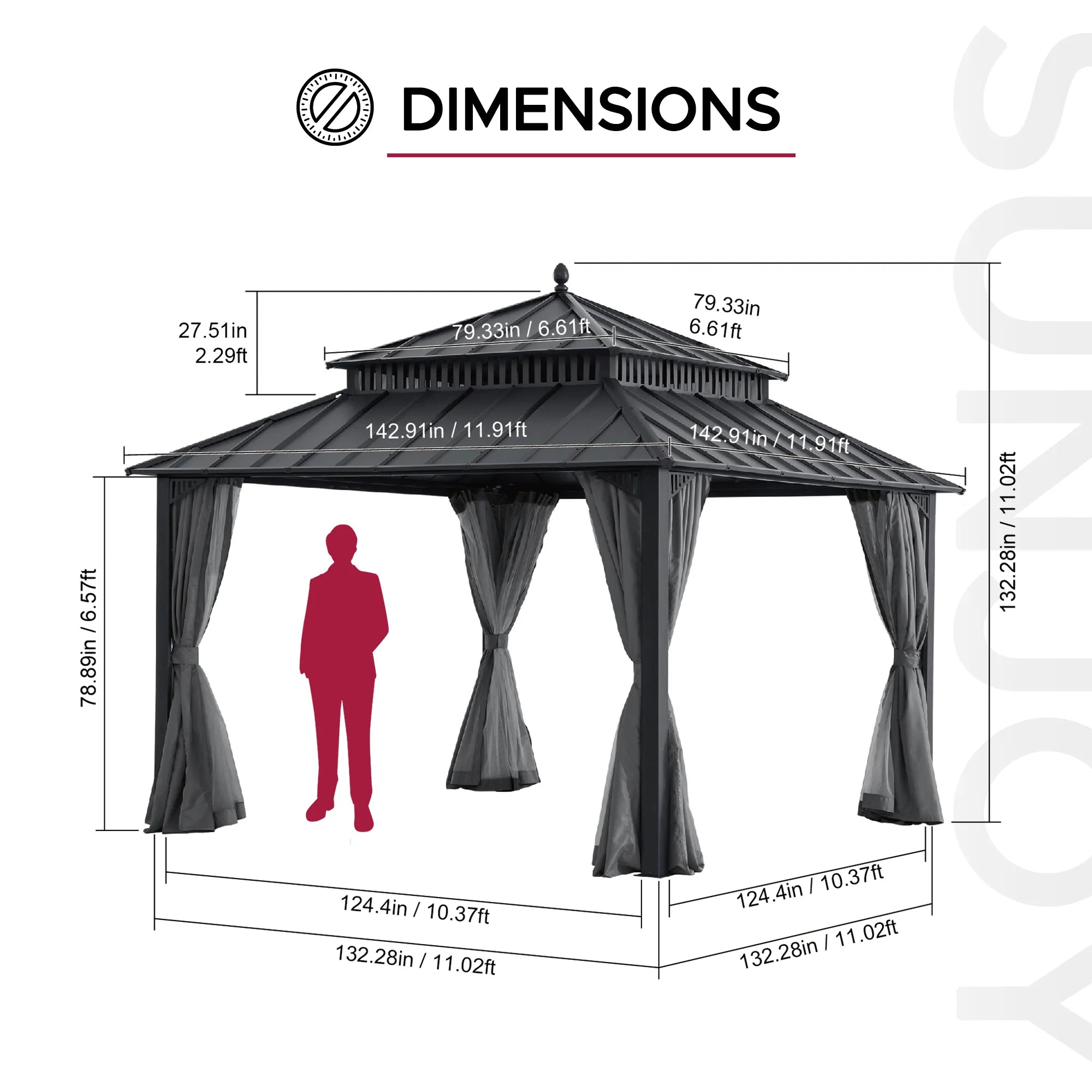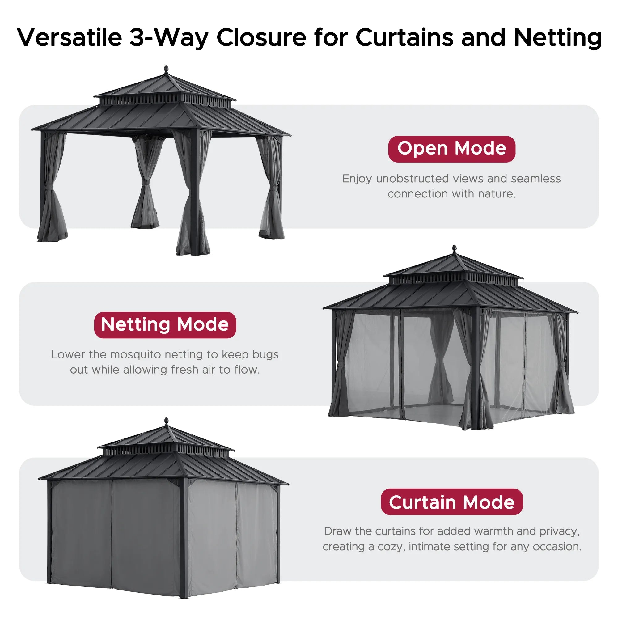 12×12 Gazebo with Netting & Curtain | Steel Roof – Gray Aluminum Posts