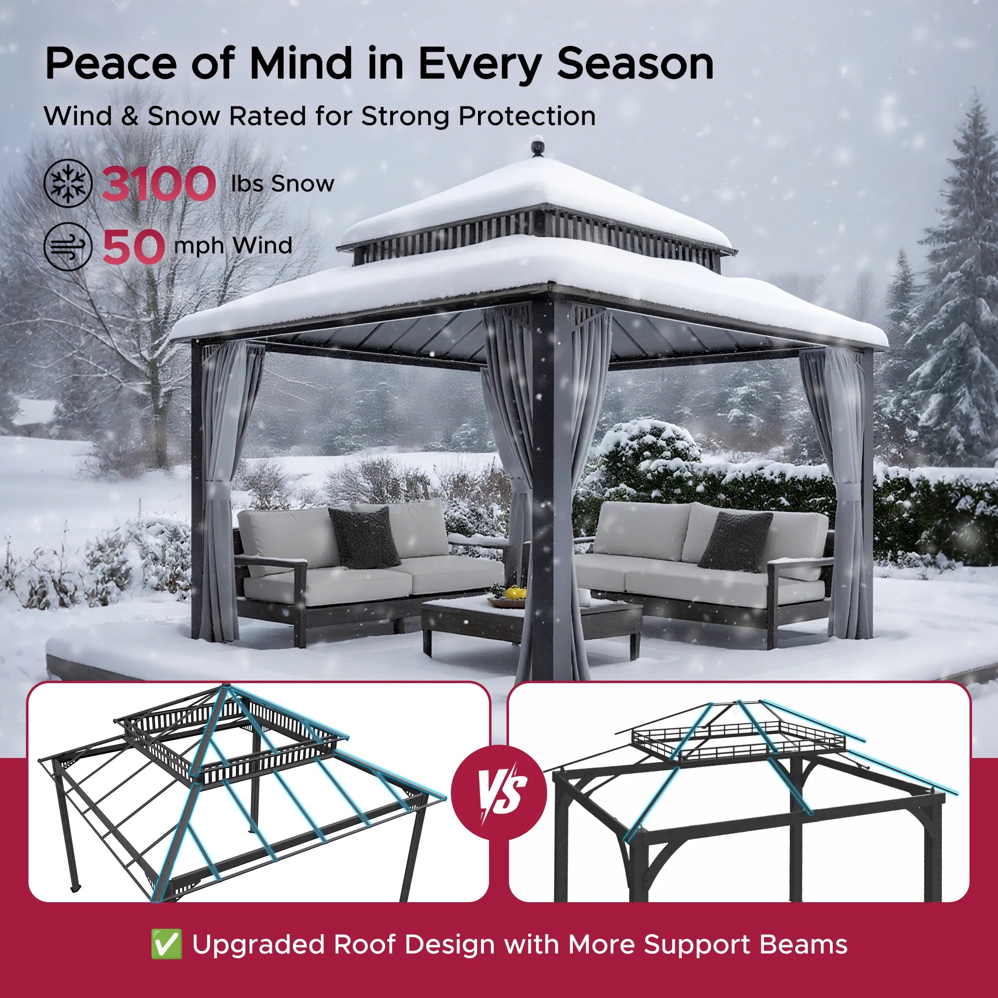 Built to withstand year-round conditions, the galvanized steel roof handles heavy snow loads and wind with ease. Zippered privacy curtains and high-density mosquito netting enclose the space to provide complete shade and insect protection. The roof’s vented, double-tier design allows heat to escape while maintaining stability and style.