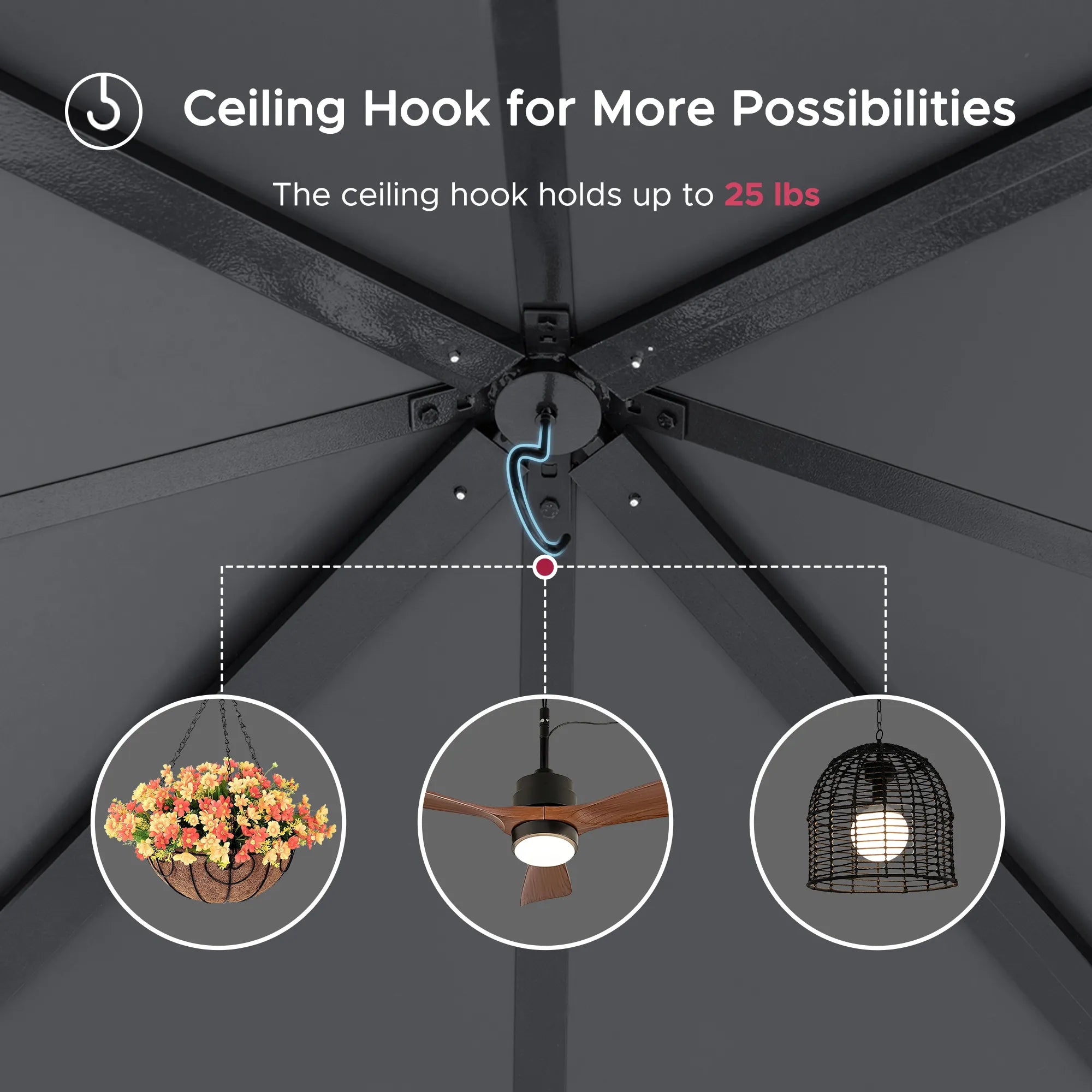 Assembly is streamlined with the insert-style roof panel system that requires fewer screws and enhances wind resistance. With a ceiling hook for custom lighting and pre-drilled anchor plates for secure setup, this gazebo makes outdoor comfort effortless and lasting.