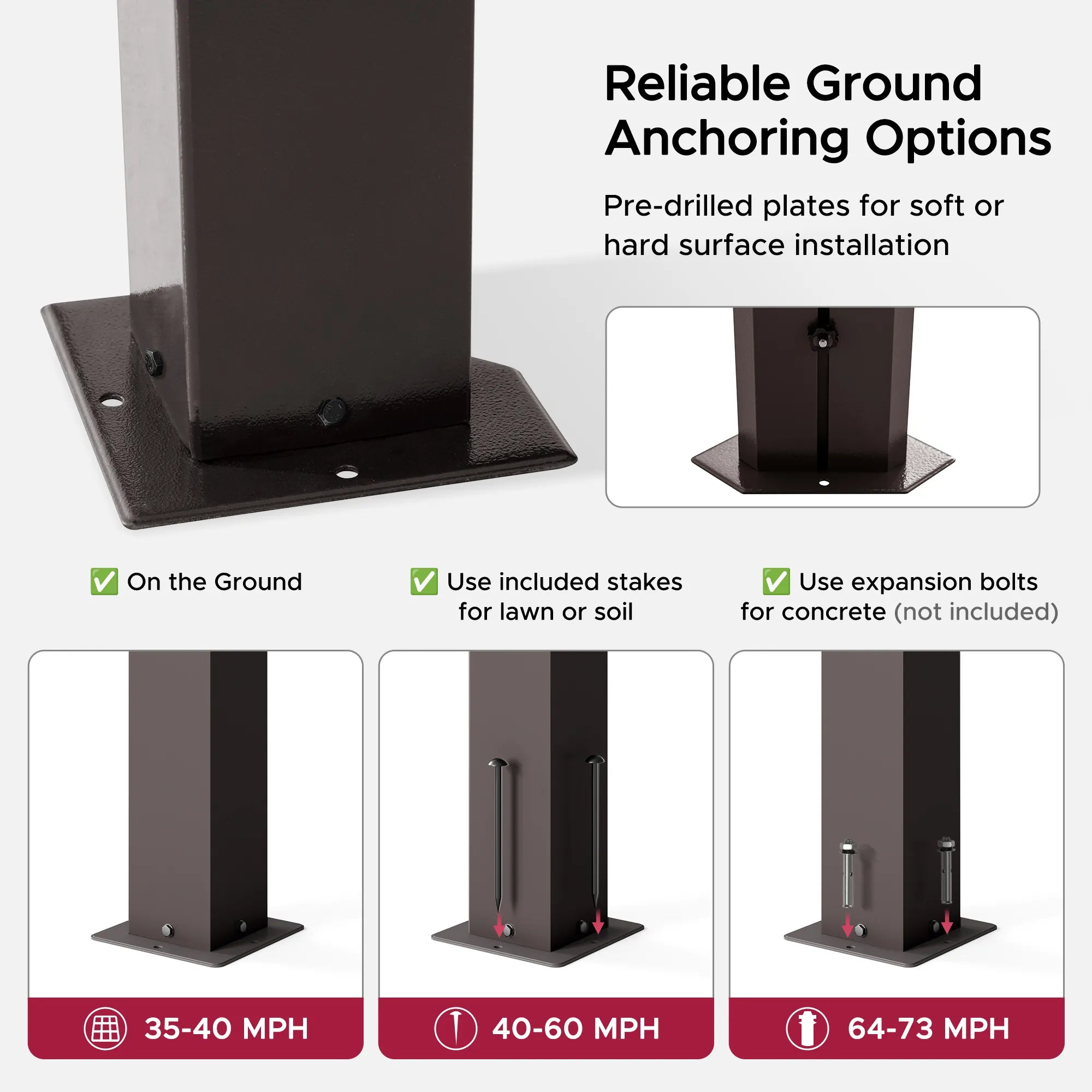 Enjoy easy assembly with a design focused on speed and secure installation. With 40% fewer screws and intuitive snap-together panels, setup is significantly faster. Stainless steel roof screws provide superior weather resistance, while three built-in hooks offer convenience for hanging lights, fans, or decor. Ground plates with pre-drilled holes ensure solid anchoring on both hard surfaces and soft ground.
