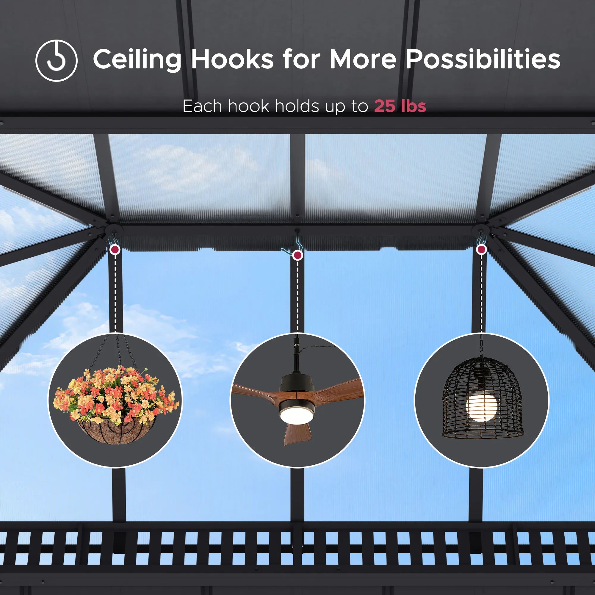 Quick to assemble, the upgraded roof system uses 30–40% fewer screws than traditional designs. Stainless steel screws on the roof enhance durability, and ceiling hooks let you personalize your space with lighting or fans. Ground plates include pre-drilled holes for easy anchoring on soft or hard surfaces.