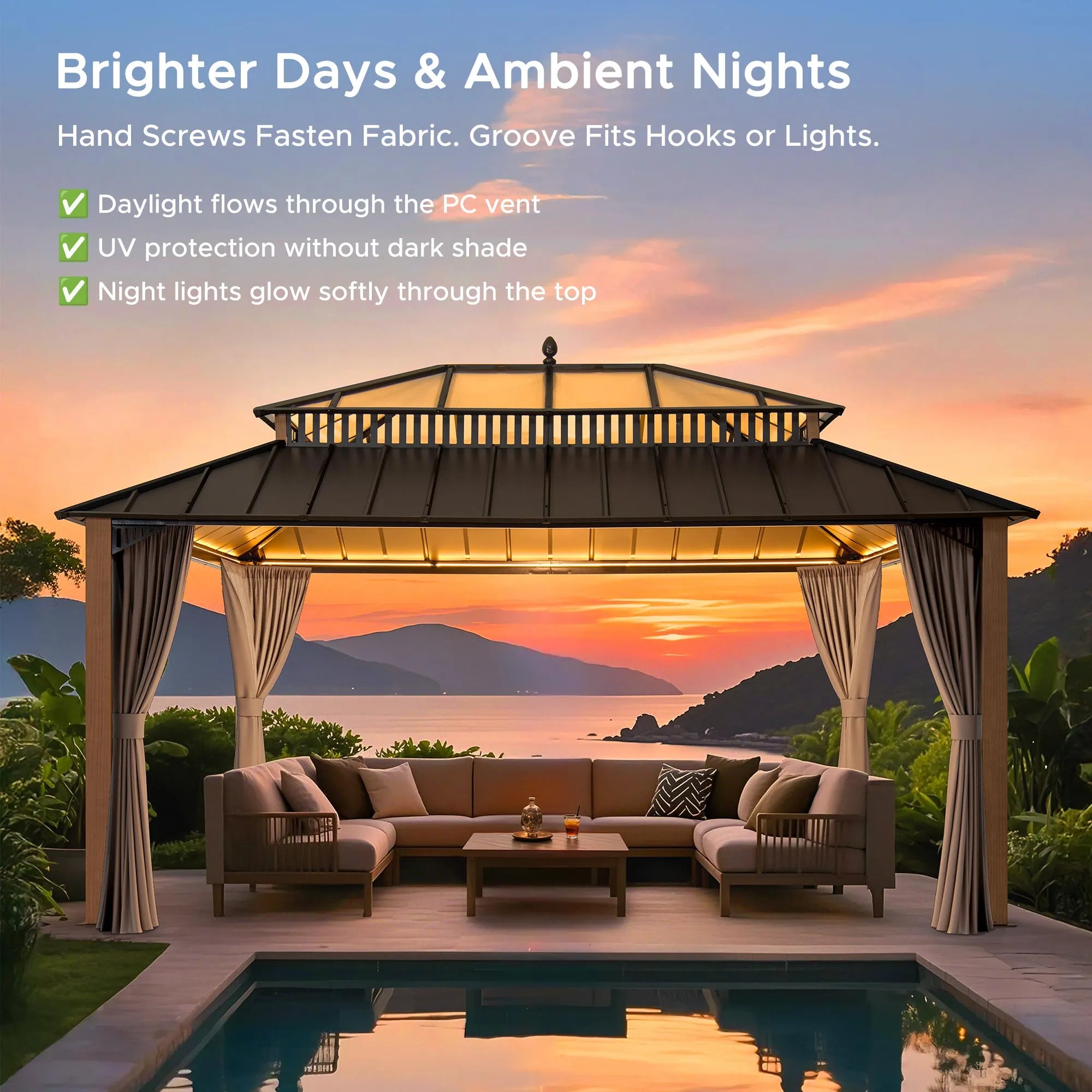 12×16 Gazebo with Netting & Curtain | Steel & PC Roof – Woodgrain Aluminum Posts