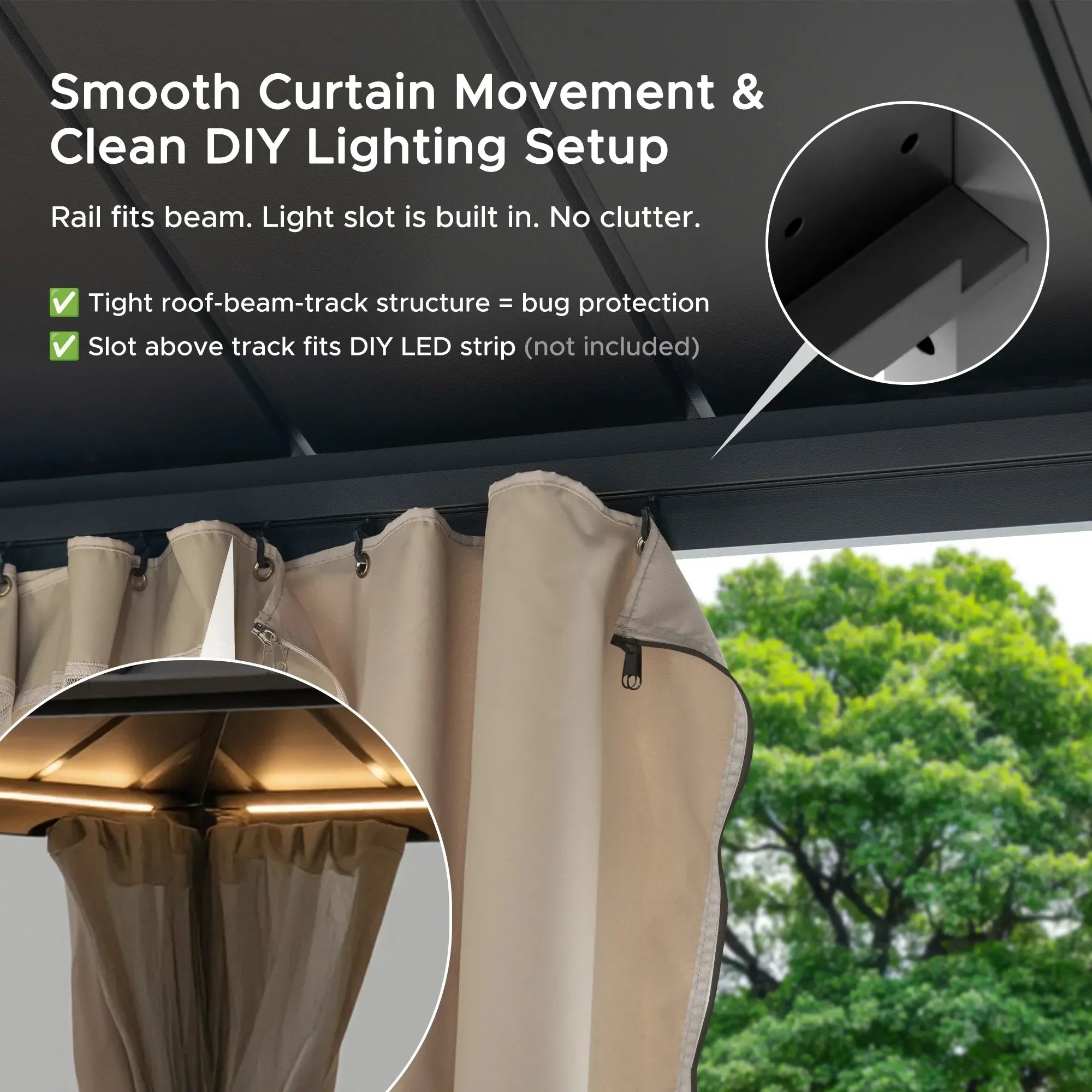 12×20 Gazebo with Netting & Curtain | Steel Roof – Woodgrain Aluminum Posts