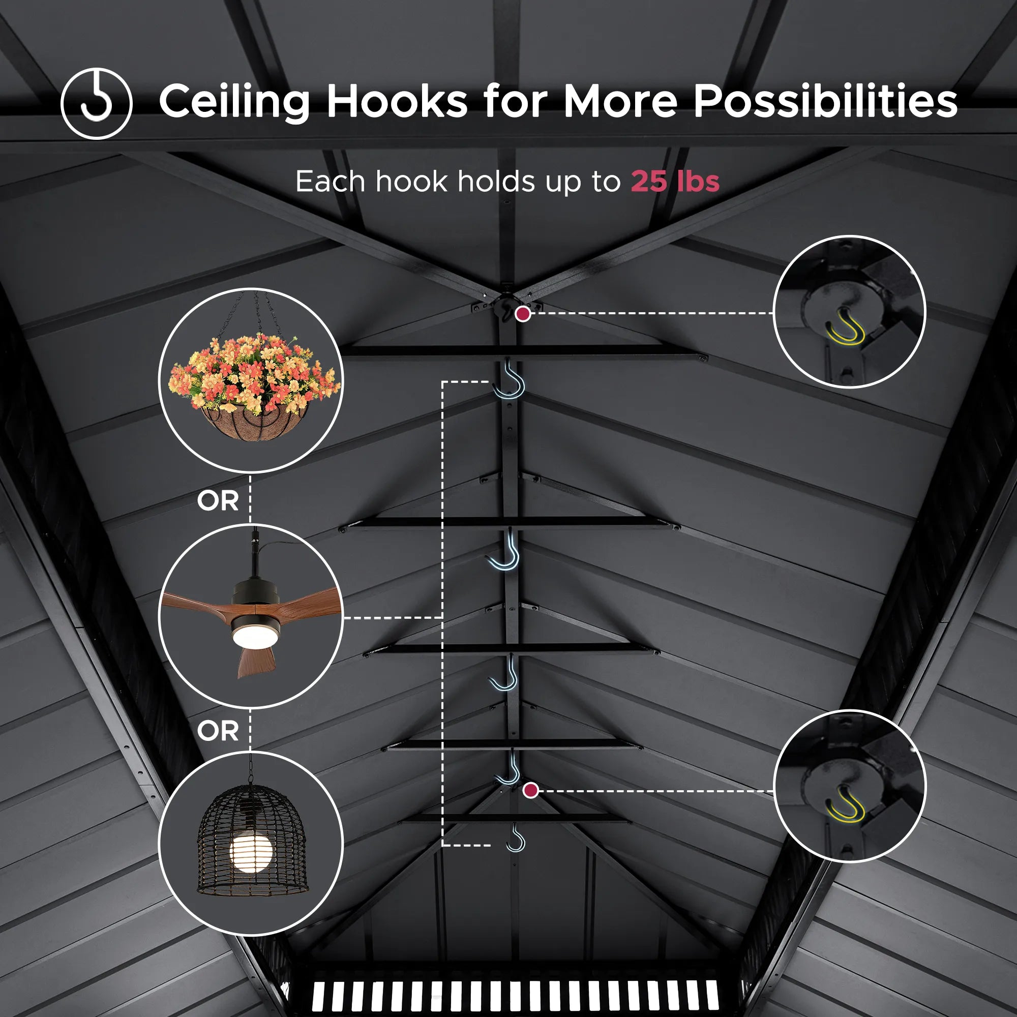 The double-tier vented roof promotes airflow while the added mesh panel on the decorative top frame helps keep insects out. Zip-up curtains and high-density mosquito netting offer privacy and protection, while three built-in ceiling hooks allow you to hang lights, fans, or seasonal decor.