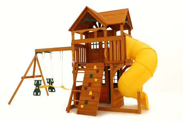 Premium wooden playset with twist tube slide, belt swings, glider, rock wall, and two-level clubhouse – built for fun, adventure, and imagination.