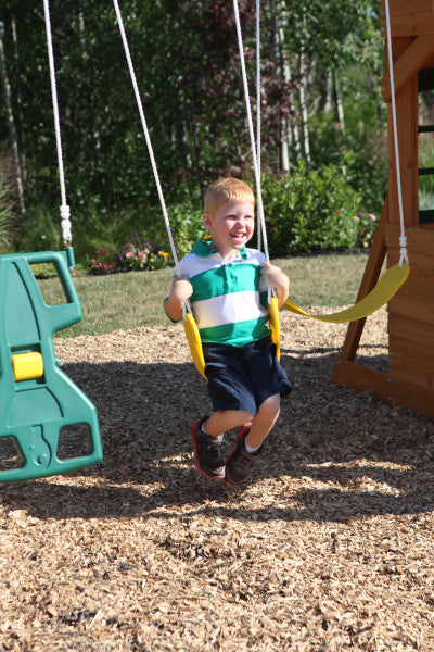 - 3-Position Swing Beam: Includes two belt swings with soft ropes and one premium two-passenger glider.