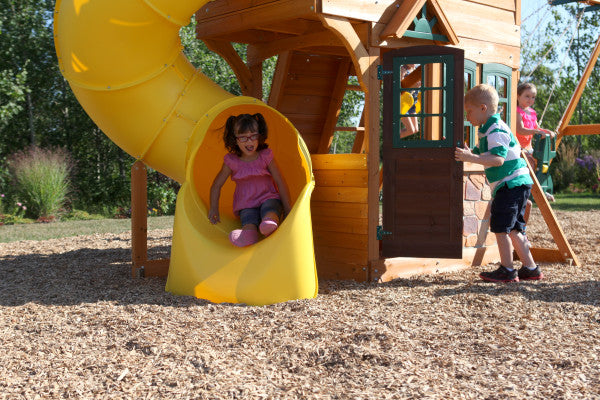 - Twist N’ Ride Tube Slide: Bright yellow spiral slide for thrilling, safe rides.