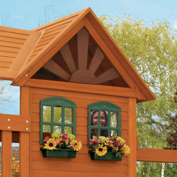 - Decorative Design: Faux stone façade, sunburst dormer, and window boxes add charm to your backyard.
