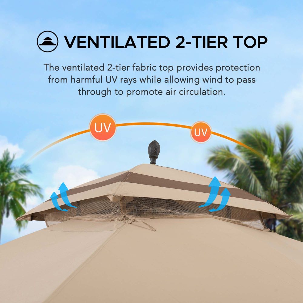 Upgrade your backyard with this stylish fabric roof gazebo. Designed with a strong metal frame, a brown double-tier canopy, and mesh curtains, it provides shade, ventilation, and elegance for outdoor dining or lounging.