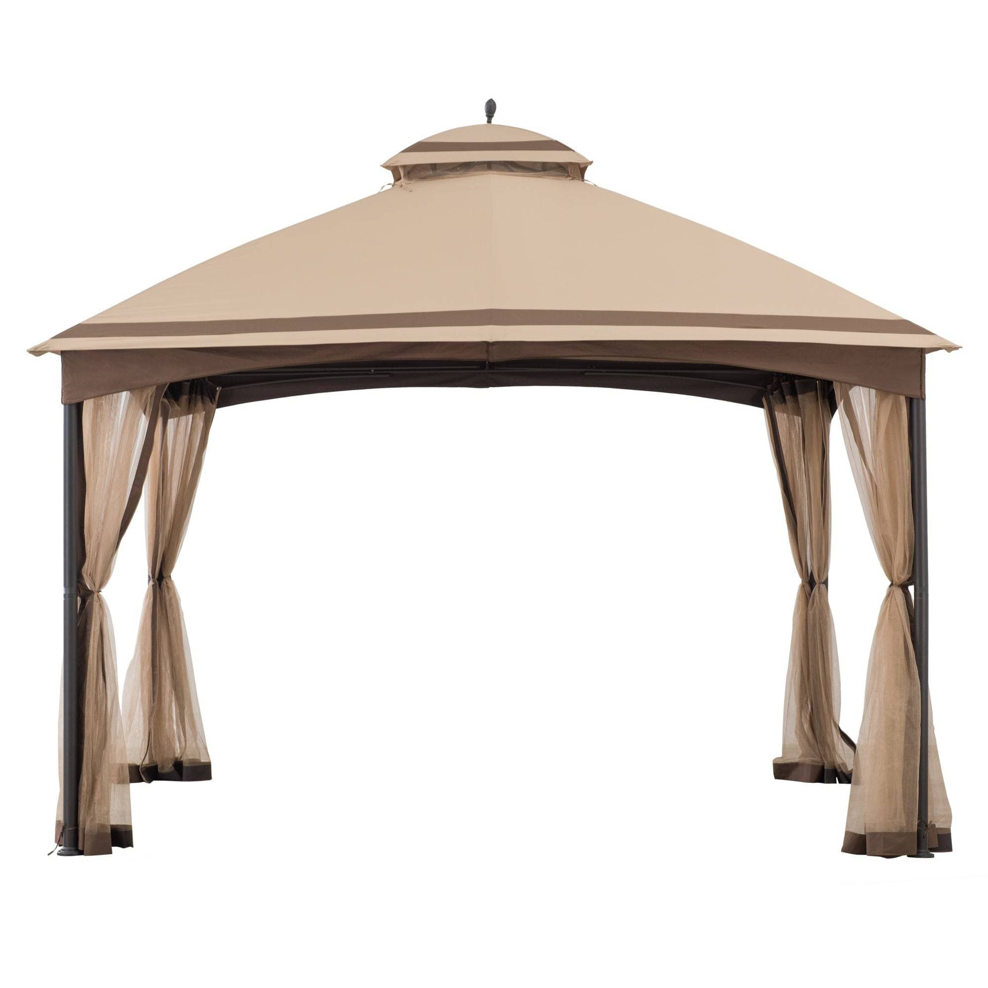 Elegant gazebo with a brown fabric canopy and mesh curtains, ideal for backyard dining, patio gatherings, and garden relaxation.