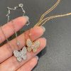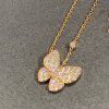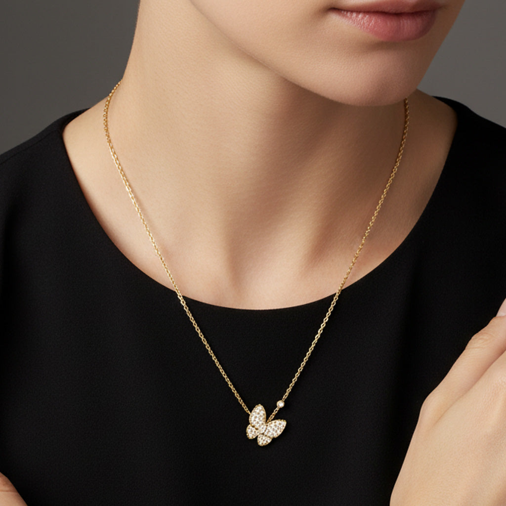 The twin-butterfly pendant is adorned with sparkling cubic zirconia (CZ), adding a delicate brilliance that enhances the design’s symbolic expression. The adjustable 42 cm chain allows for versatile styling, whether worn alone or layered with other pieces.