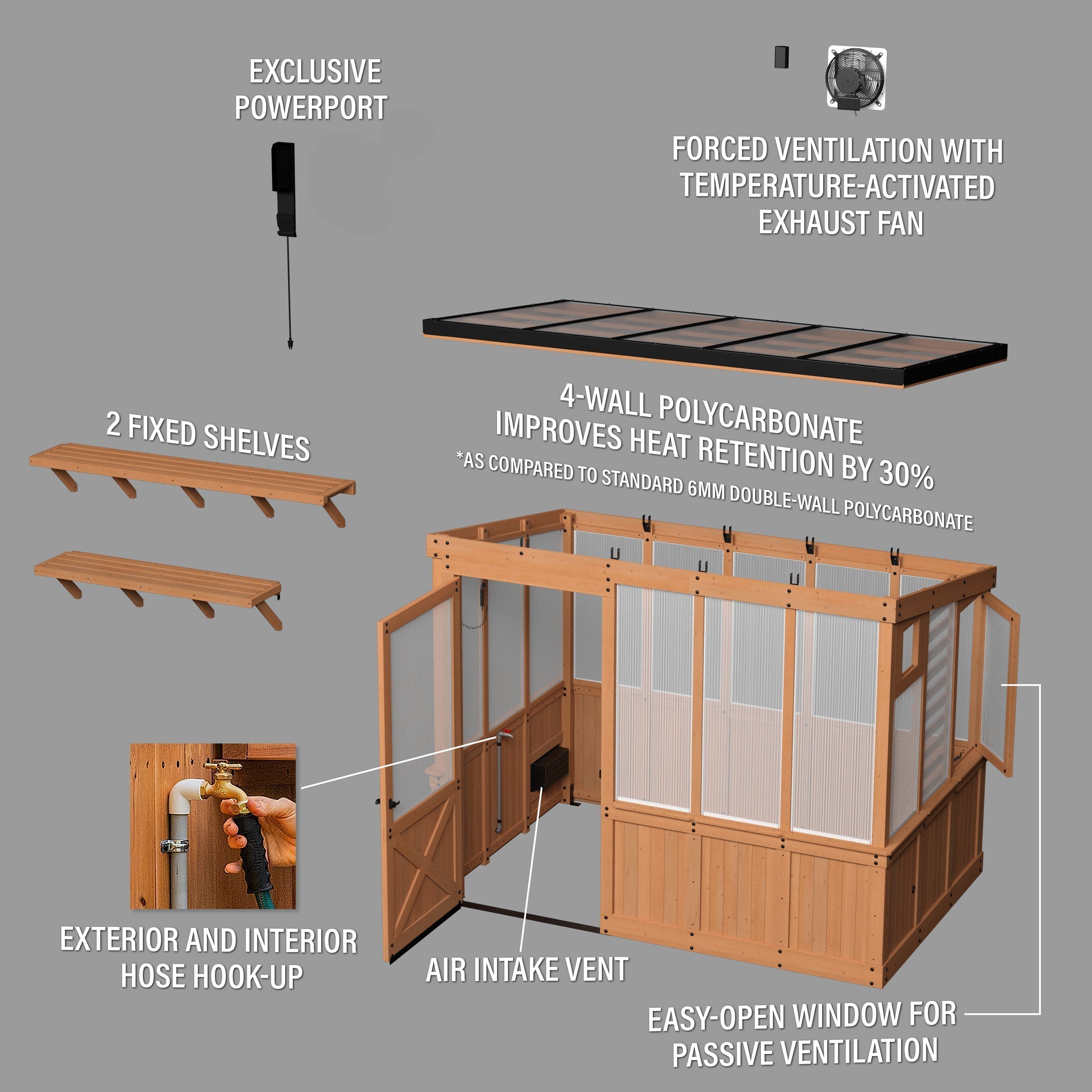 - Material: Cedar wood frame + polycarbonate wall & roof panels