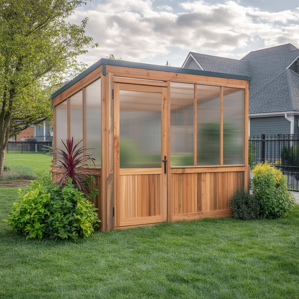A modern cedar greenhouse with durable polycarbonate panels — perfect for year-round gardening, plant protection, and stylish backyard design.