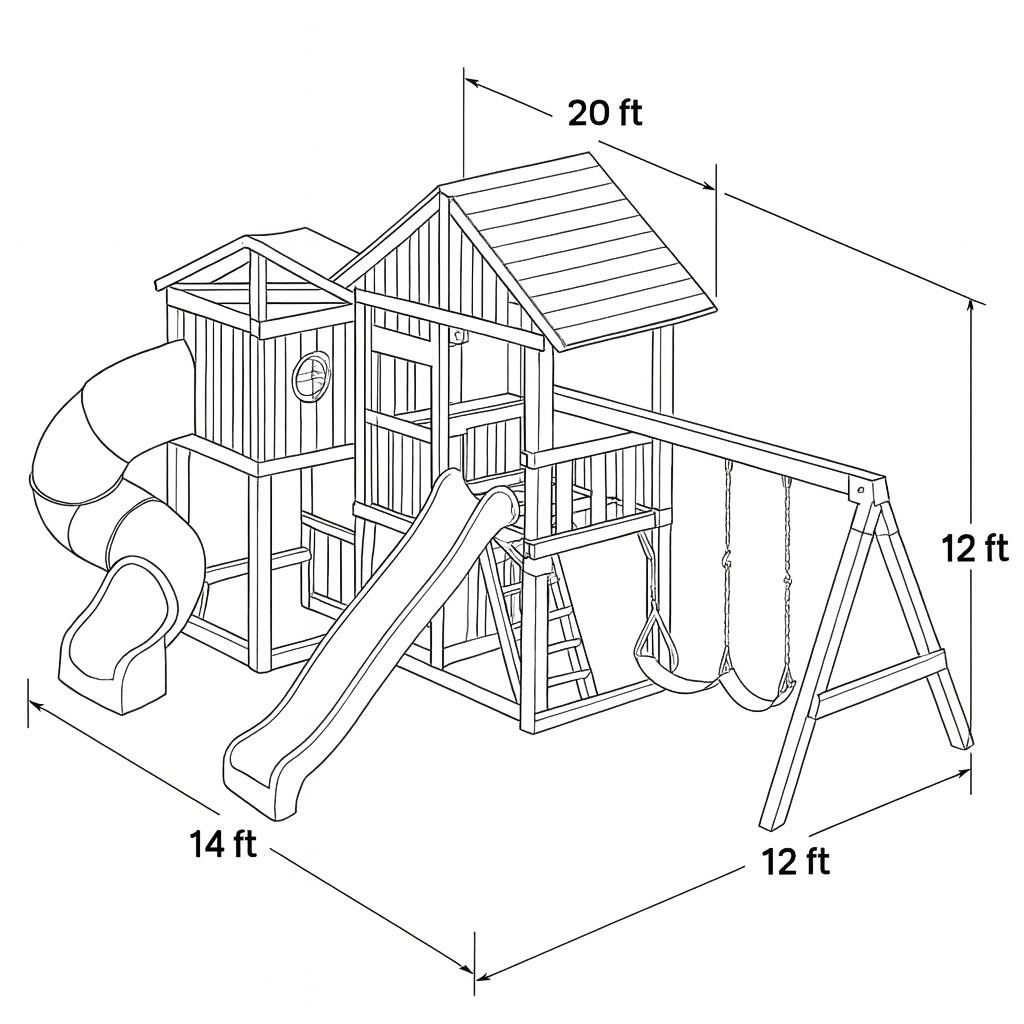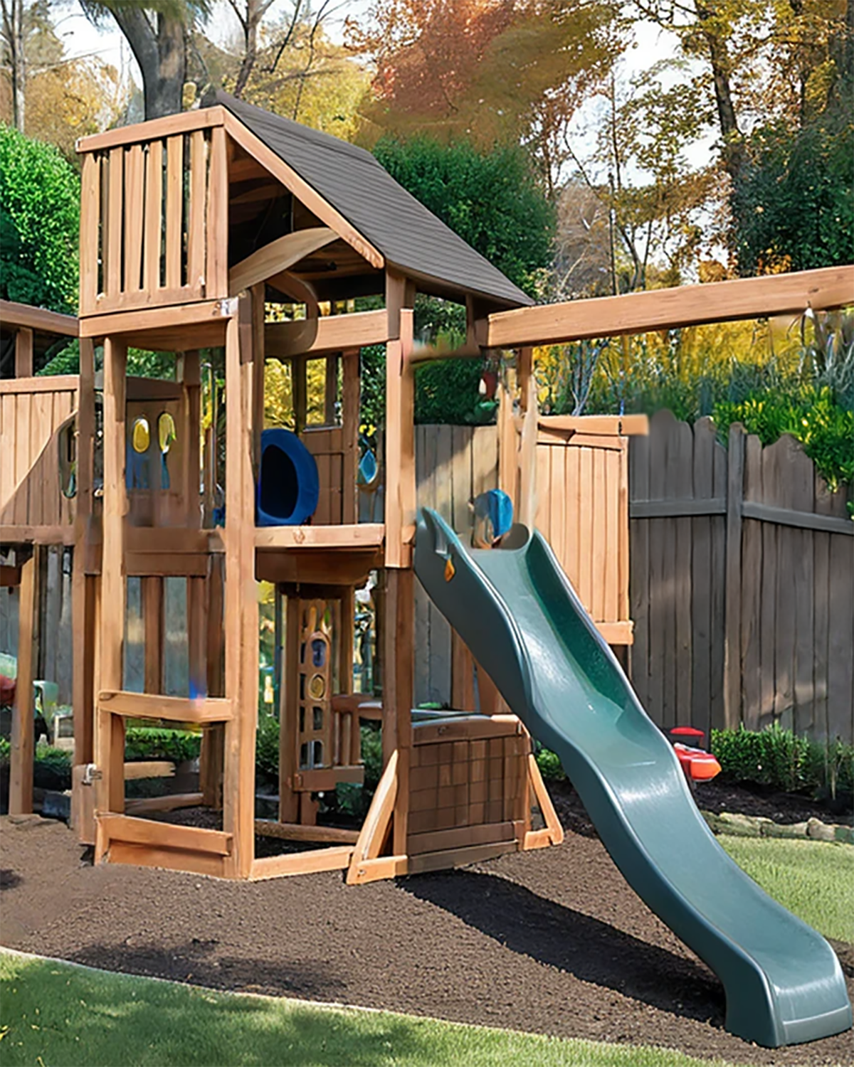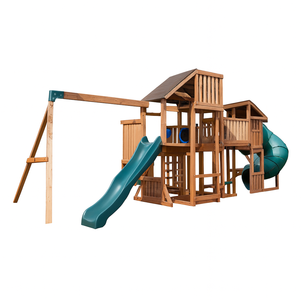 - Play Features: Tube slide, wave slide, 2 swings, trapeze bar, climbing wall, dual towers, connecting bridge