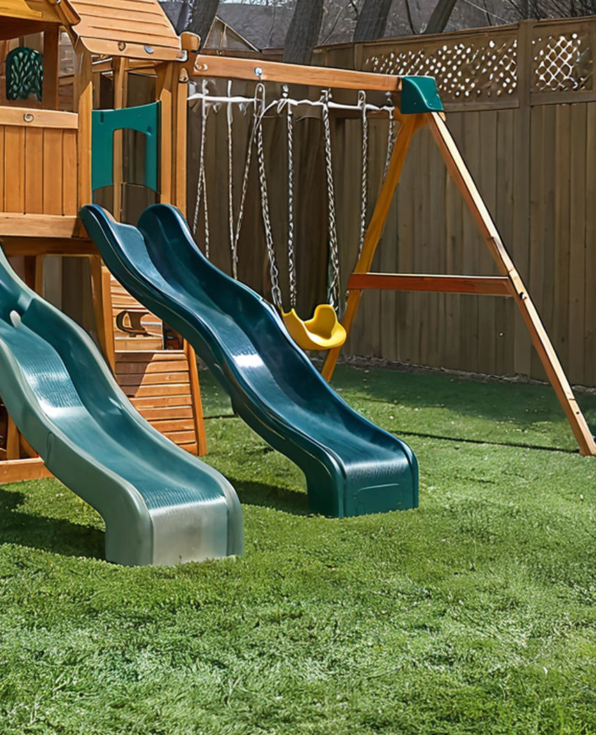 - Play Features: Dual wave slides, 2 swings, toddler seat, climbing wall, ladder, clubhouse