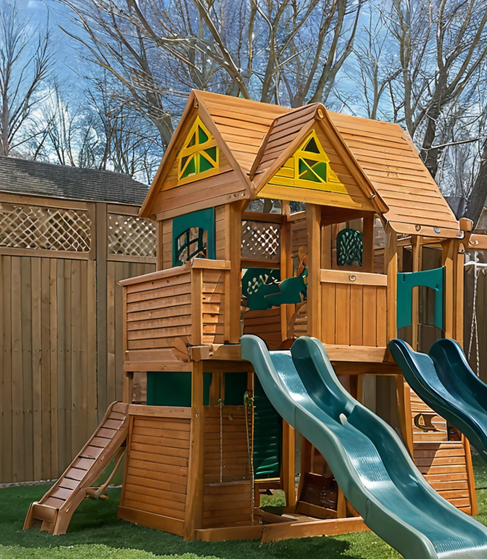 Delivered with secure packaging, insurance, and tracking. Includes a 5-year limited warranty on cedar wood and 1-year warranty on slides and swings.
