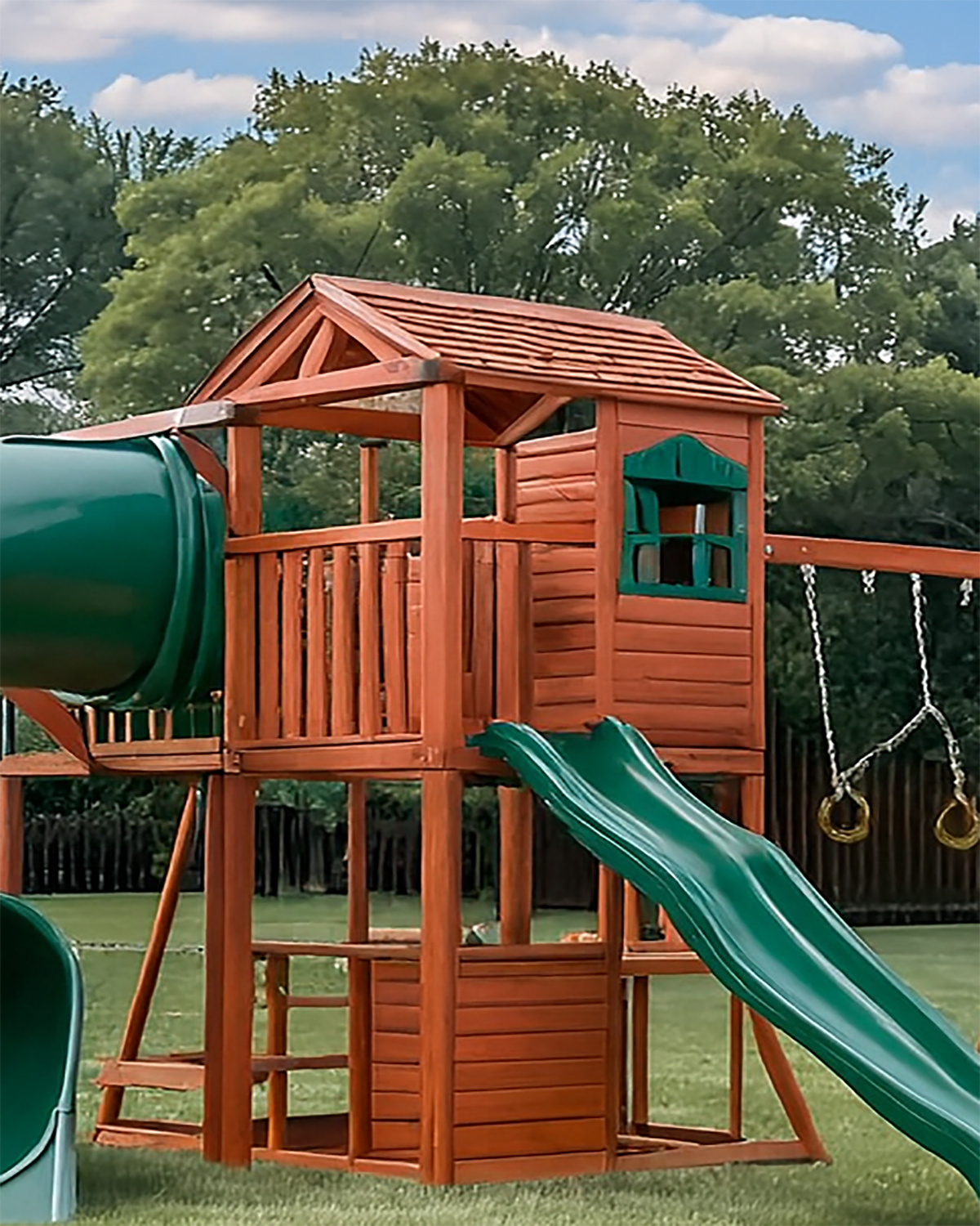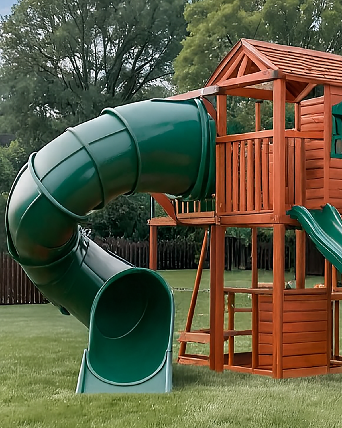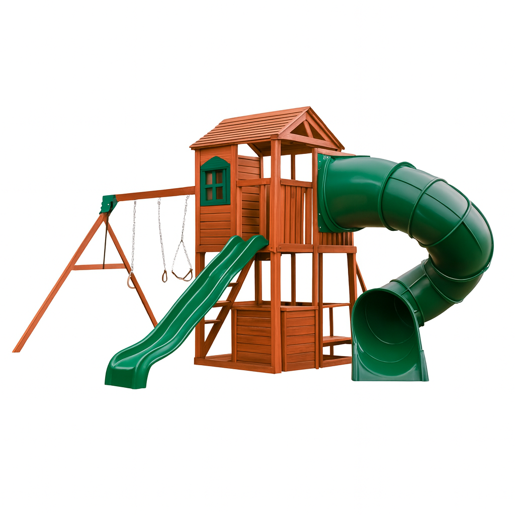 A premium cedar wood playset featuring a spiral tube slide, wave slide, swings, trapeze, and multi-level clubhouse—durable, safe, and fun for kids.
