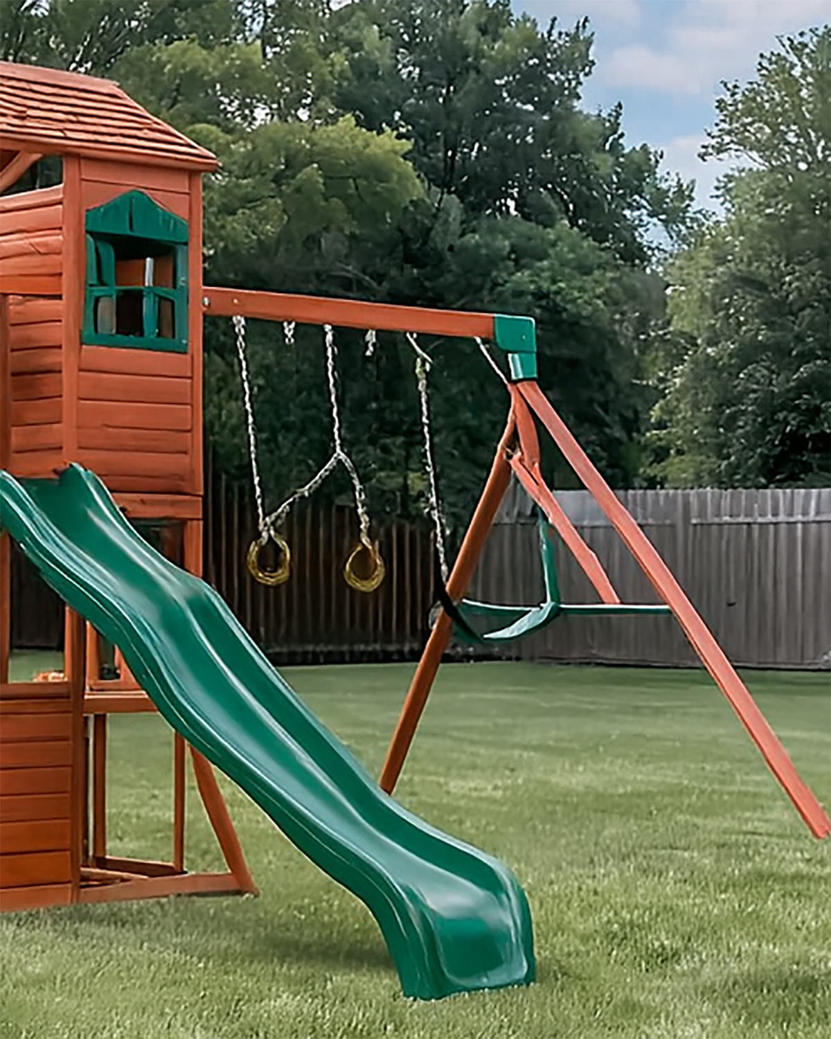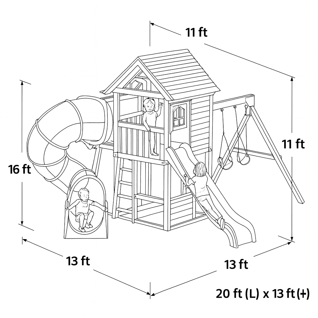 • Play Features: Tube slide, wave slide, 2 swings, trapeze rings, clubhouse tower