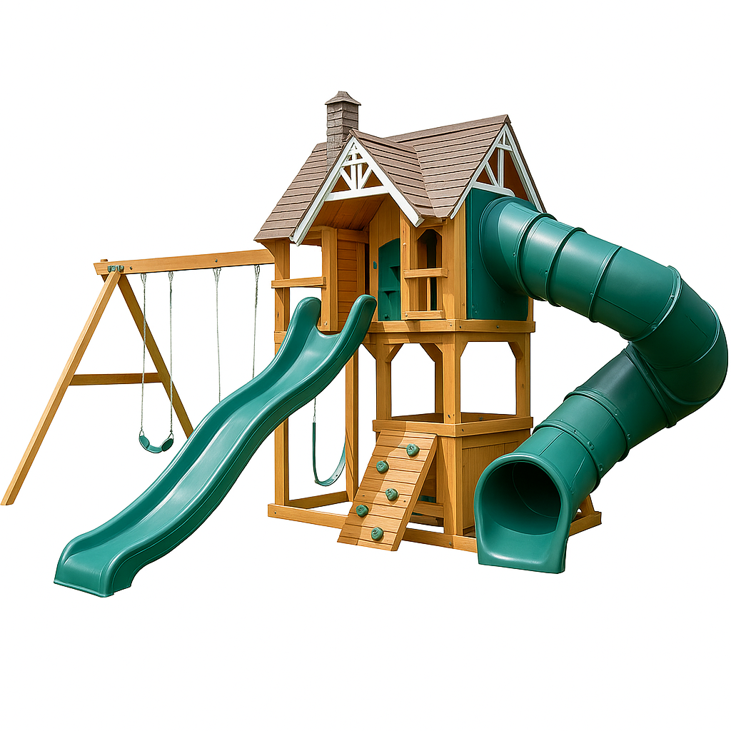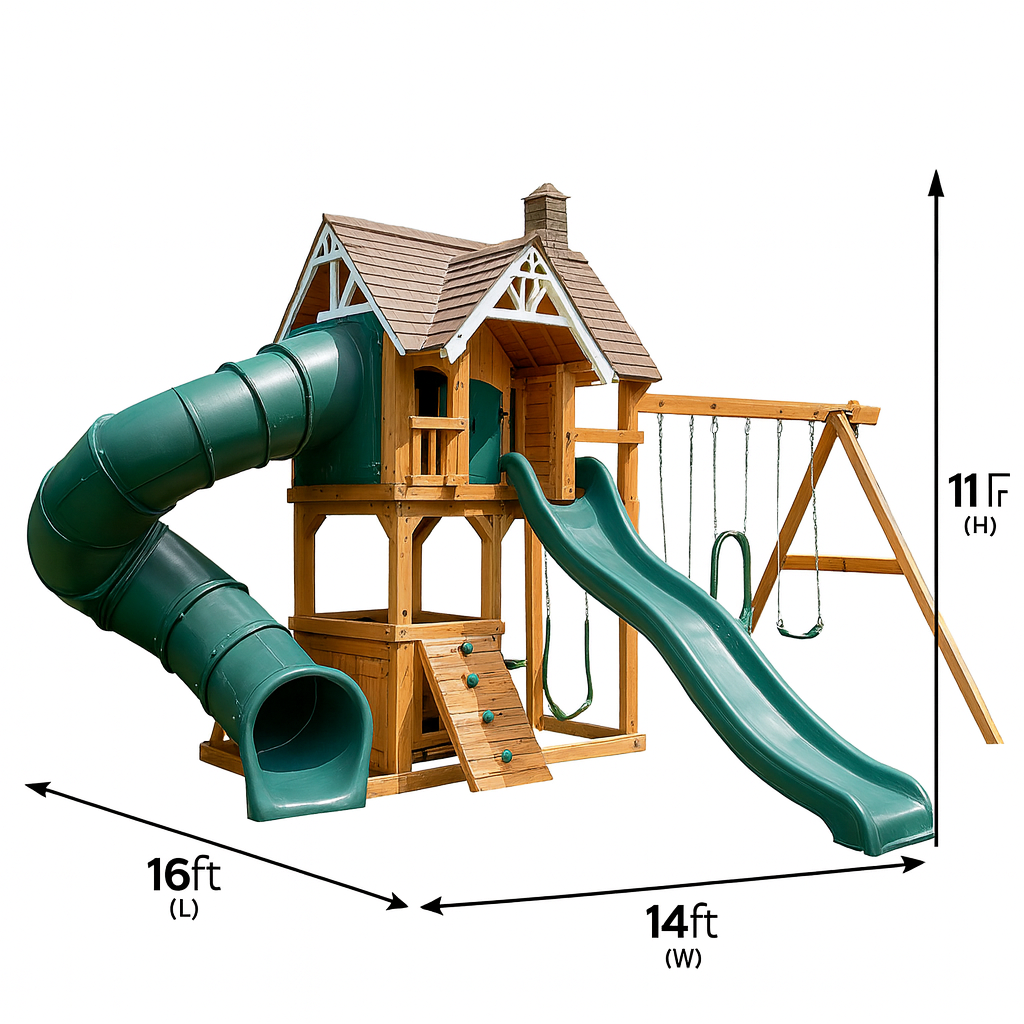 - Play Features: Tube slide, wave slide, 2 swings, trapeze bar, rock wall, playhouse tower