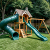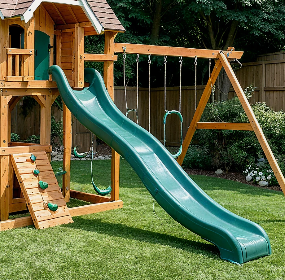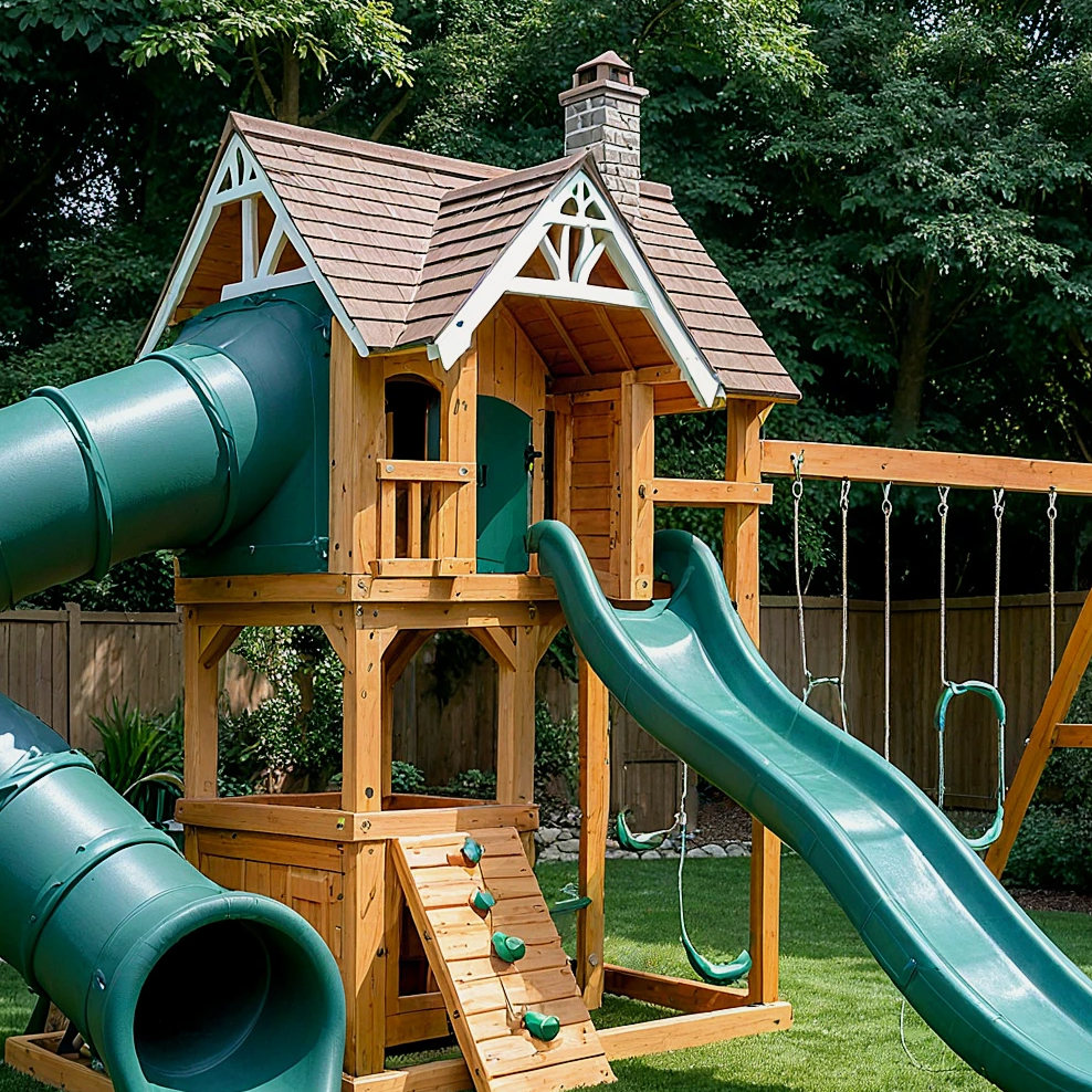 Bring the magic of playtime home with the Cedar Wood Outdoor Playset, styled like a storybook cottage with premium cedar craftsmanship. Featuring a spiral tube slide, a straight wave slide, swings, climbing wall, and a whimsical multi-level playhouse, this durable and safe playground inspires imagination, adventure, and active fun for children of all ages.