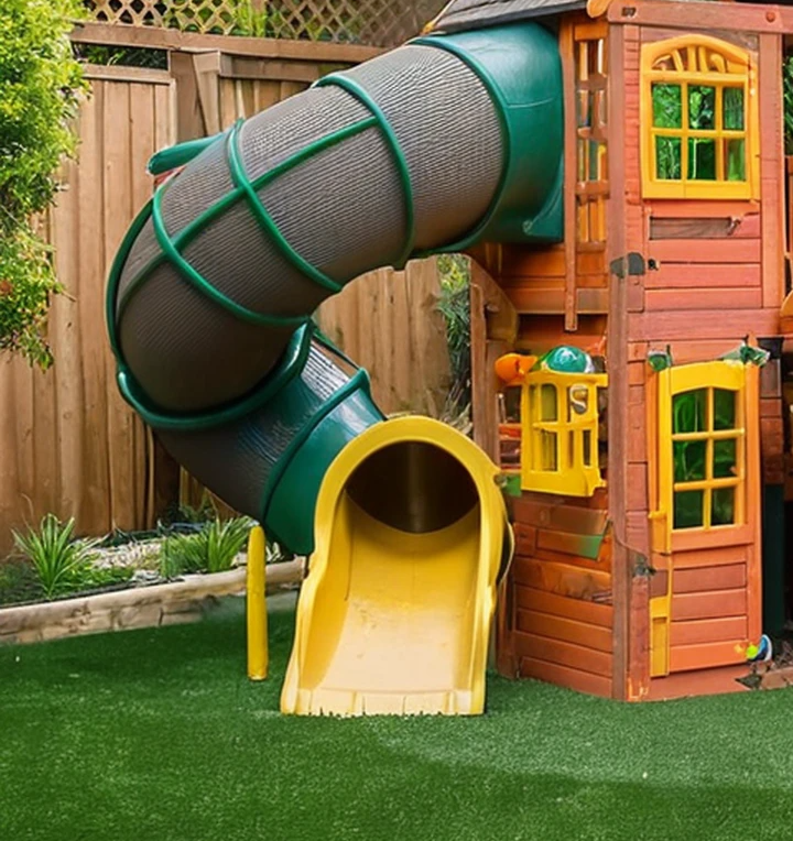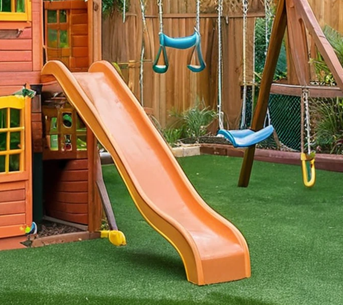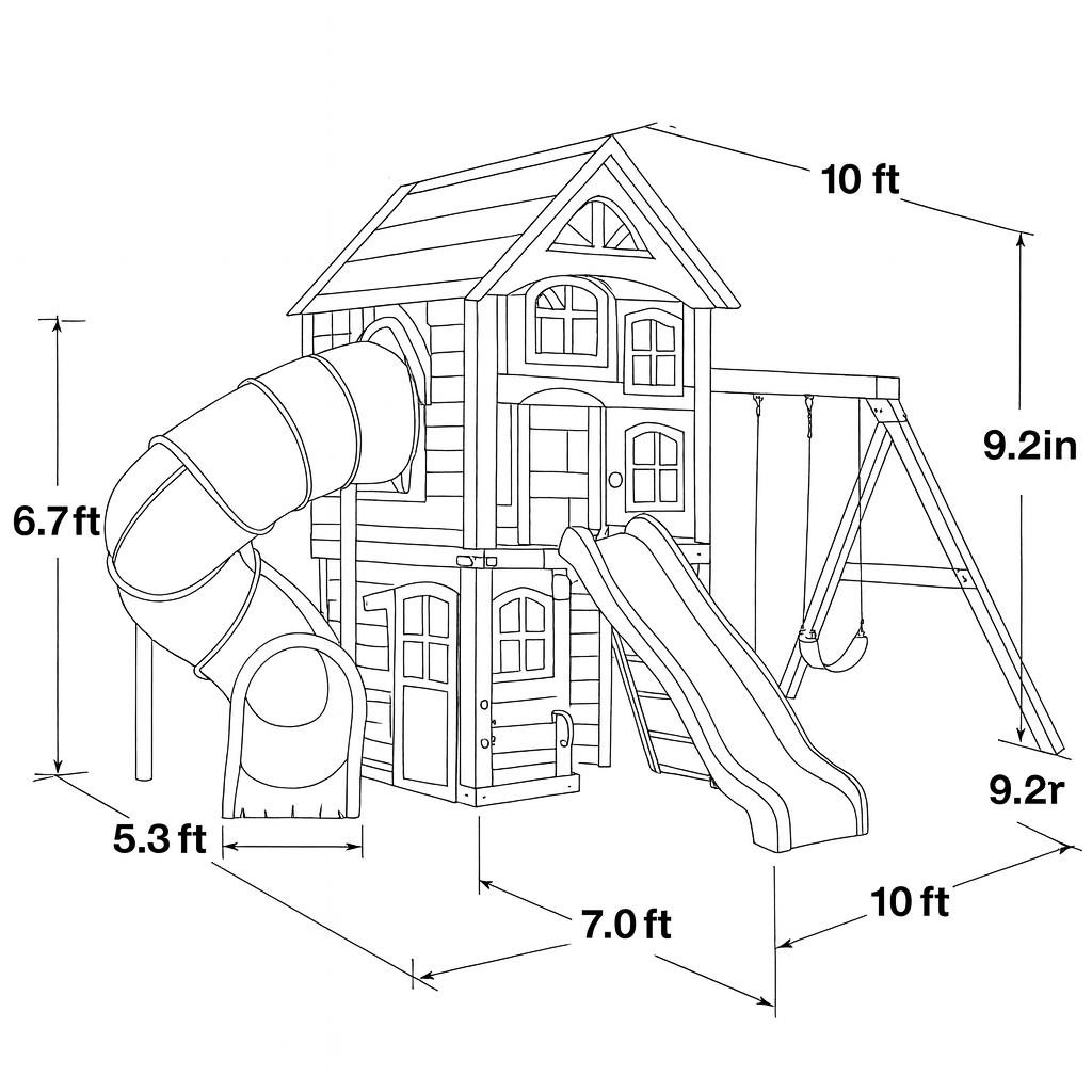 - Play Features: Tube slide, wave slide, 2 swings, trapeze bar, two-level playhouse