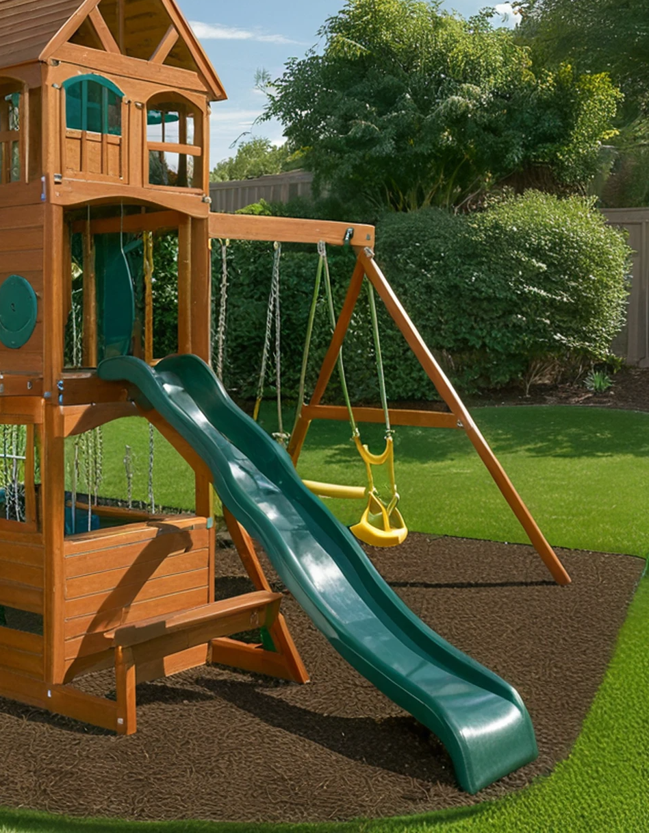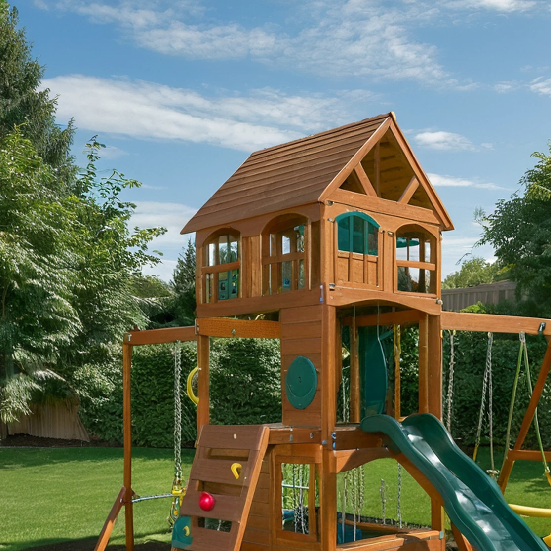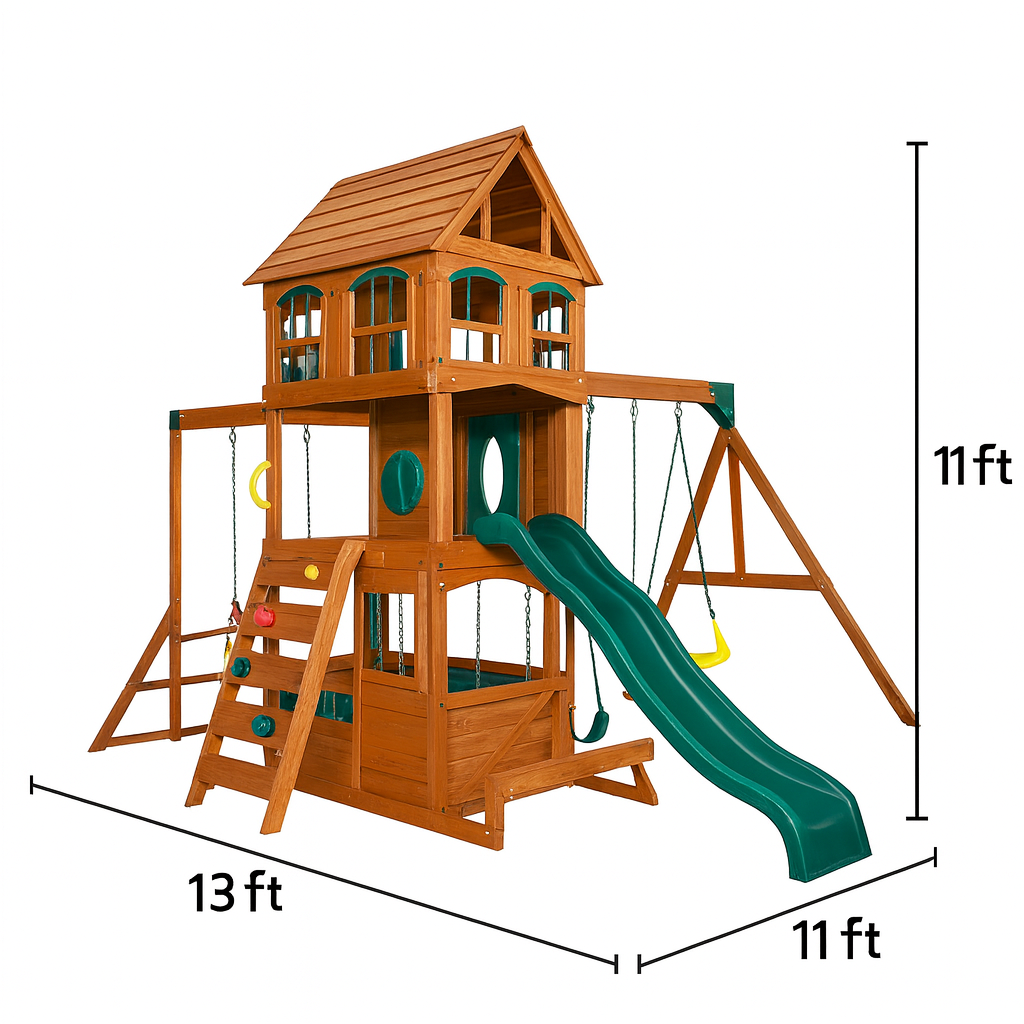 • Multi-Level Clubhouse: Includes windows, shaded lower area, and an elevated tower for creative play.