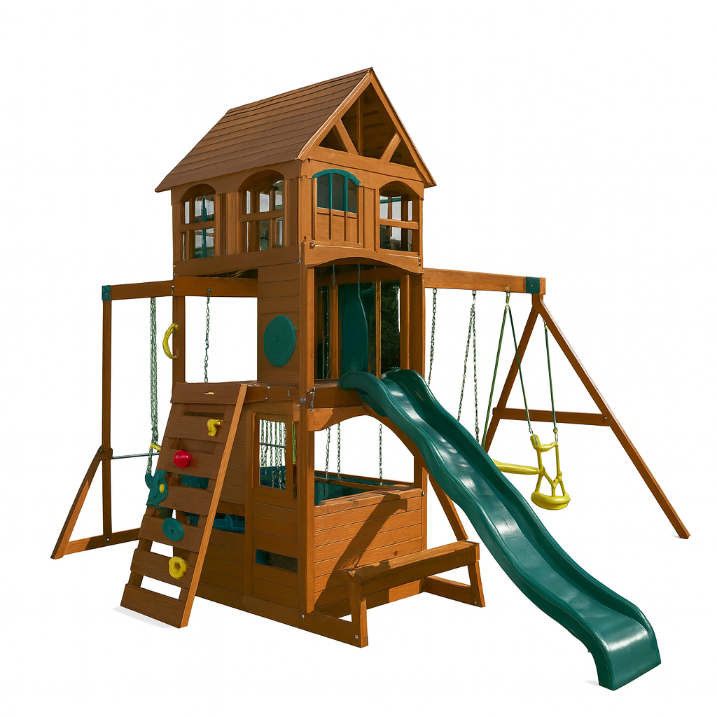 • Play Features: Wave slide, climbing wall, 2 swings, trapeze bar, sandbox, picnic bench, clubhouse tower